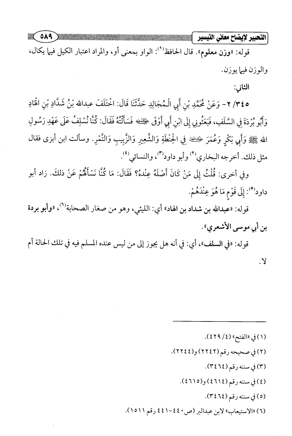 345/ 2 - وَعَنْ مُحَمَّدِ بْنِ أَبِي الْمُجَالِدِ حَدَّثَنَا قَالَ: اخْتَلَفَ عبد الله بْنُ شَدَّادِ بْنِ الْهَادِ وَأَبُو بُرْدَةَ فِي السَّلفِ، فَبَعَثُونِي إِلَى ابْنِ أَبِي أَوْفَى - رضي الله عنه - فَسَأَلْتُهُ فَقَالَ: كُنَّا نُسْلِفُ عَلَى عَهْدِ رَسُولِ الله - صلى الله عليه وسلم - وَأَبِي بَكْرٍ وَعُمَرَ - رضي الله عنهما - فِي الحنْطَةِ وَالشَّعِيرِ وَالزَّبِيبِ وَالتَّمْرِ. وسألت ابن أبزى فقال مثل ذلك. أخرجه البخاري (¬2) وأبو داود (¬3)، والنسائي (¬4).