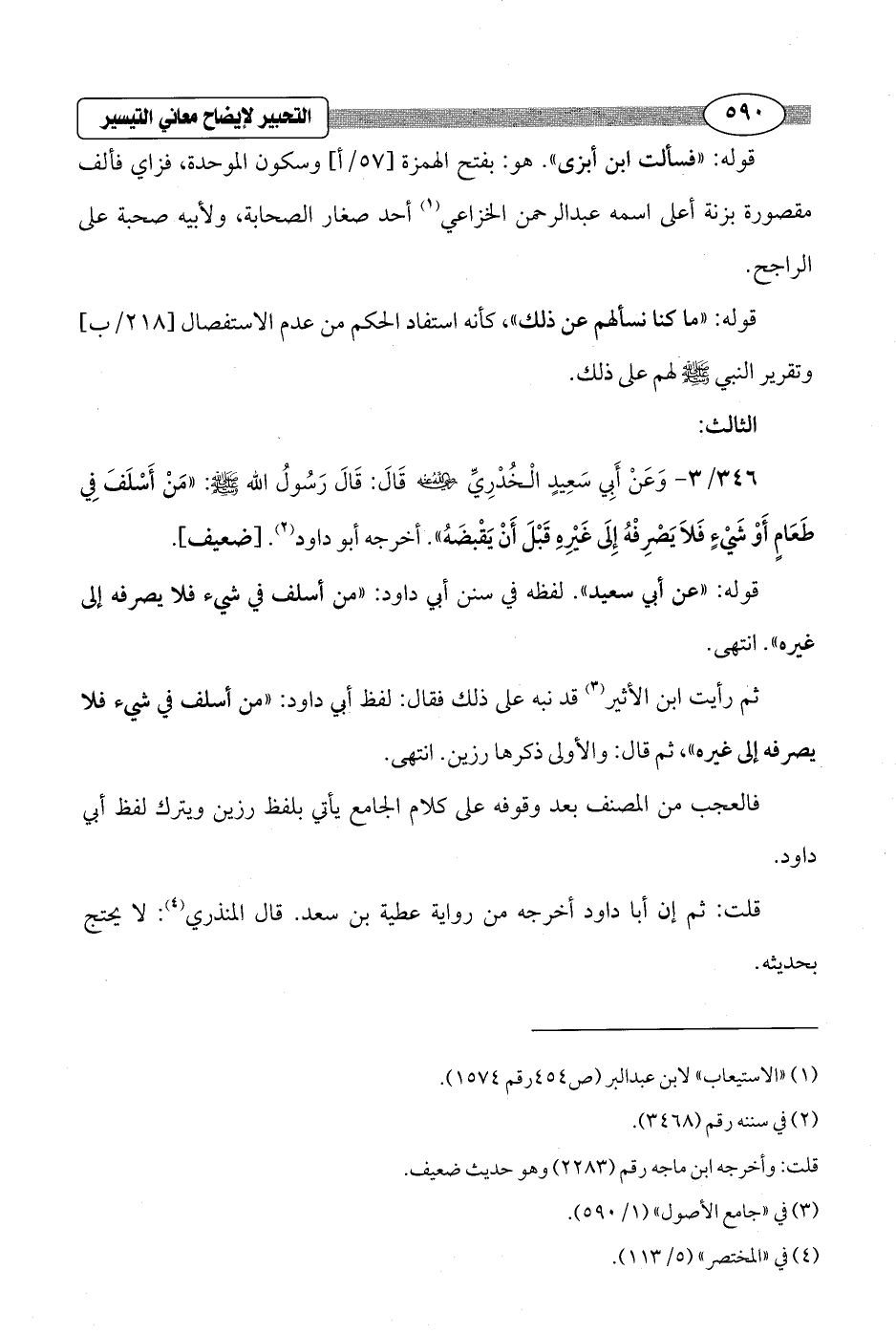 346/ 3 - وَعَنْ أَبِي سَعِيدٍ الْخُدْرِيِّ - رضي الله عنه - قَالَ: قَالَ رَسُولُ الله - صلى الله عليه وسلم -: "مَنْ أَسْلَفَ فِي طَعَامٍ أَوْ شَيْءٍ فَلاَ يَصْرِفْهُ إِلَى غيْرِهِ قَبْلَ أَنْ يَقْبضَهُ". أخرجه أبو داود (¬2). [ضعيف].