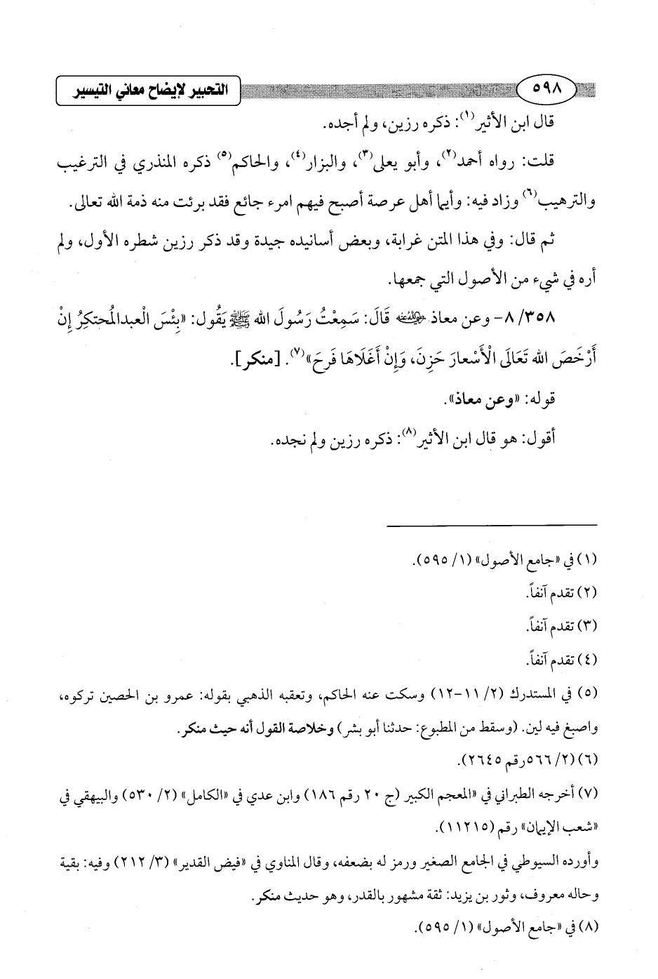 358/ 8 - وعن معاذ - رضي الله عنه - قَالَ: سَمِعْتُ رَسُولَ الله - صلى الله عليه وسلم - يَقُول: "بِئْسَ الْعبد المُحتكِرُ إِنْ أَرْخَصَ الله تَعَالَى الْأَسْعارَ حَزِنَ، وَإِنْ أَغَلَاهَا فَرحَ" (¬7). [منكر].