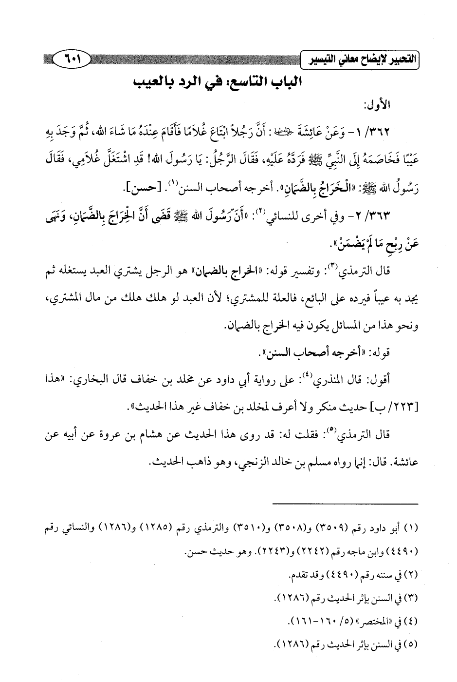 362/ 1 - وَعَنْ عَائِشَةَ - رضي الله عنها -: أَنَّ رَجُلاً ابْتَاعَ غُلاَمًا فَأَقامَ عِنْدَهُ مَا شَاءَ الله، ثُمَّ وَجَدَ بِهِ عَيْبًا فَخَاصَمَهُ إِلَى النَّبِيِّ - صلى الله عليه وسلم - فَرَدَّهُ عَلَيْهِ، فَقَالَ الرَّجُلُ: يَا رَسُولَ الله! قَدِ اشْتَغَلَّ غُلاَمِي، فَقَالَ رَسُولُ الله - صلى الله عليه وسلم -: "الْخَرَاجُ بِالضَّمَانِ". أخرجه أصحاب السنن (¬1) [حسن].