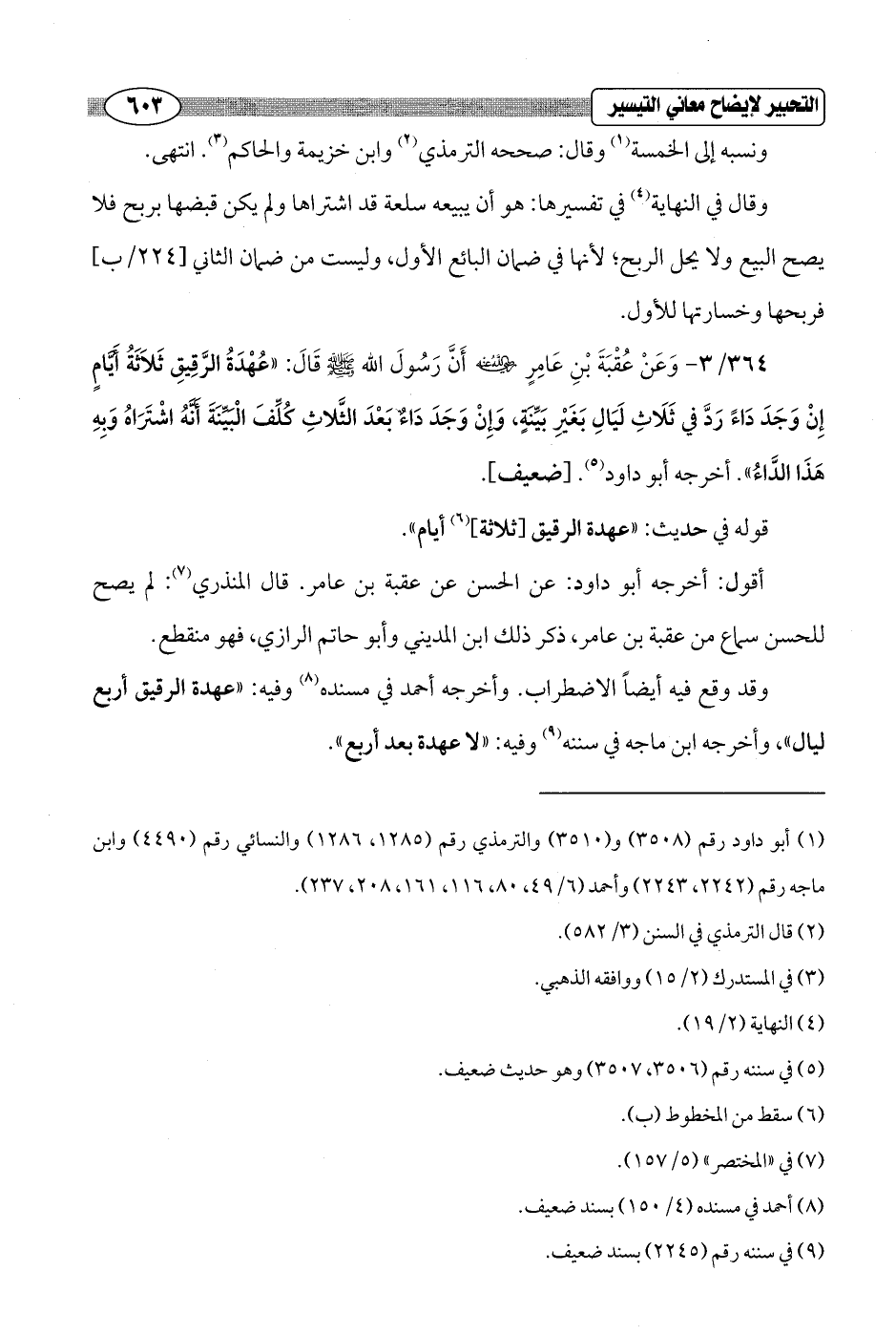 364/ 3 - وَعَنْ عُقْبَةَ بْنِ عَامِرٍ - رضي الله عنه - أَنَّ رَسُولَ الله - صلى الله عليه وسلم - قَالَ: "عُهْدَةُ الرَّقِيقِ ثَلاَثَةُ أَيَّامٍ إِنْ وَجَدَ دَاءً رَدَّ في ثَلَاثِ لَيَالِ بَغَيْرِ بَيِّنَةٍ, وإنْ وَجَدَ دَاءٌ بَعْدَ الثَّلاثِ كُلِّفَ الْبَيِّنَةَ أَنَّهُ اشْتَرَاهُ وَبِهِ هَذَا الدَّاءُ". أخرجه أبو داود (¬5). [ضعيف].