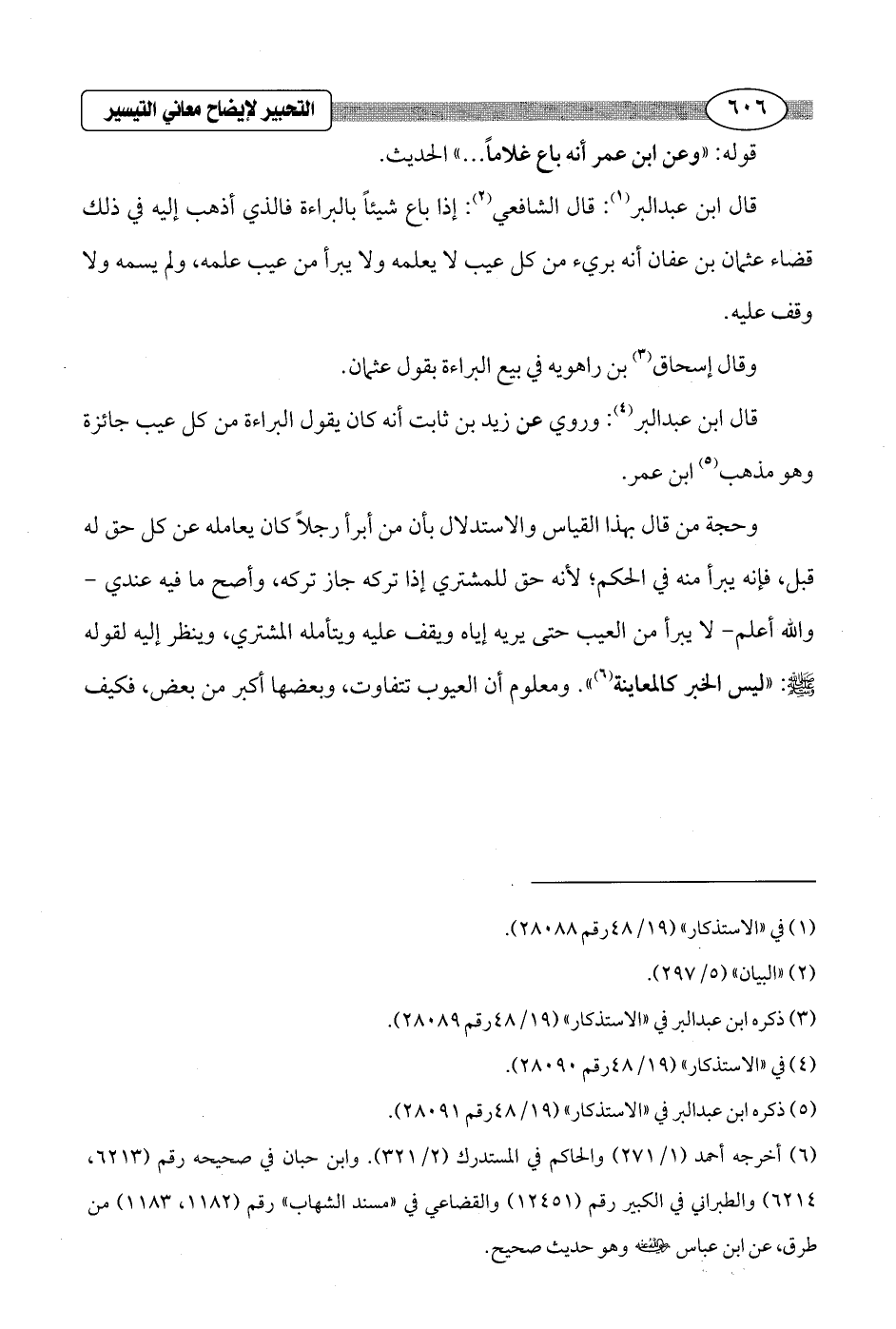 قال ابن عبد البر (¬4): وروي عن زيد بن ثابت أنه كان يقول البراءة من كل عيب جائزة وهو مذهب (¬5) ابن عمر.