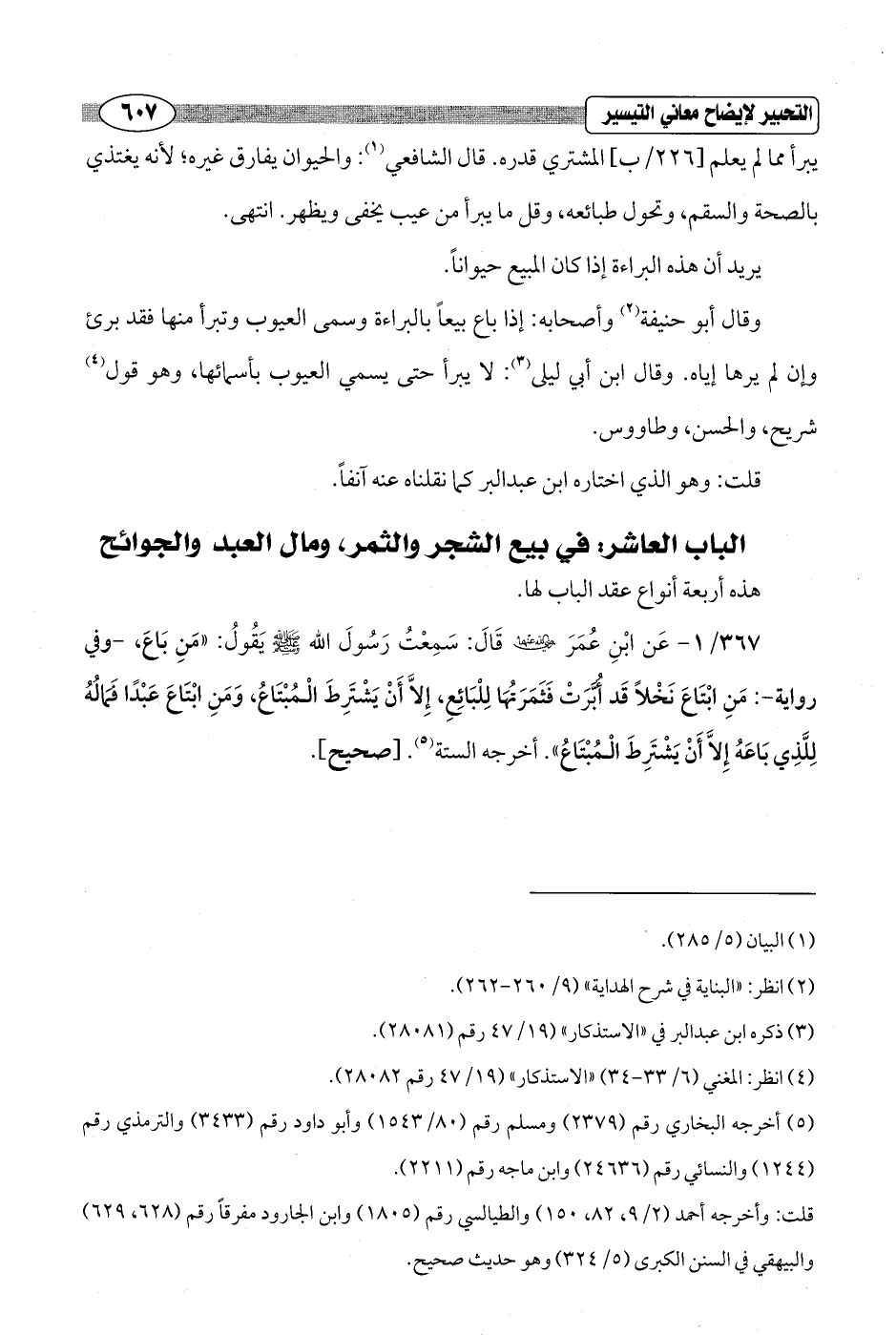 367/ 1 - عَن ابْنِ عُمَرَ - رضي الله عنهما - قَالَ: سَمِعْتُ رَسُولَ الله - صلى الله عليه وسلم - يَقُولُ: "مَنِ بَاعَ، - وفي رواية -: مَنِ ابْتَاعَ نَخْلاً قَد أُبَّرَتْ فَثَمَرَتُهَا لِلْبَائِعِ، إِلاَّ أَنْ يَشْتَرِطَ الْمُبْتَاعُ، وَمَنِ ابْتَاعَ عَبْدًا فَمَالُهُ لِلَّذِي بَاعَهُ إِلاَّ أَنْ يَشْتَرِطَ الْمُبْتَاعُ". أخرجه الستة (¬5). [صحيح].