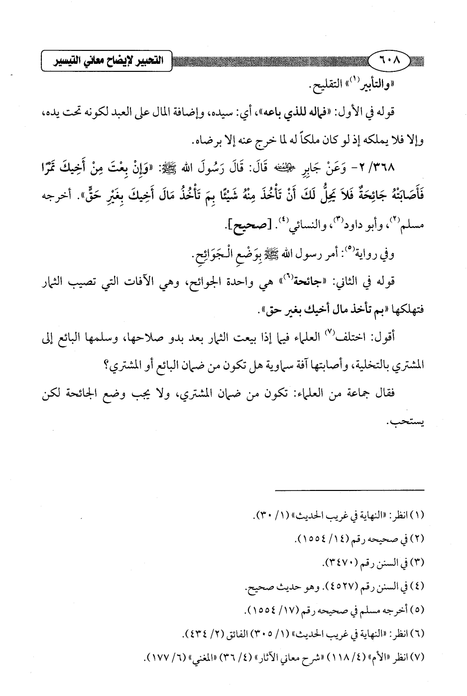 368/ 2 - وَعَنْ جَابِرِ - رضي الله عنه - قَالَ: قَالَ رَسُولَ الله - صلى الله عليه وسلم -: "وَإِنْ بِعْتَ مِنْ أَخِيكَ تَمْرًا فَأَصَابَتْهُ جَائِحَةٌ فَلاَ يَحِلُّ لَكَ أَنْ تَأْخُذَ مِنْهُ شَيْئًا بِمَ تَأْخُذُ مَالَ أَخِيكَ بِغَيْرِ حَقٍّ". أخرجه مسلم (¬2)، وأبو داود (¬3)، والنسائي (¬4). [صحيح].