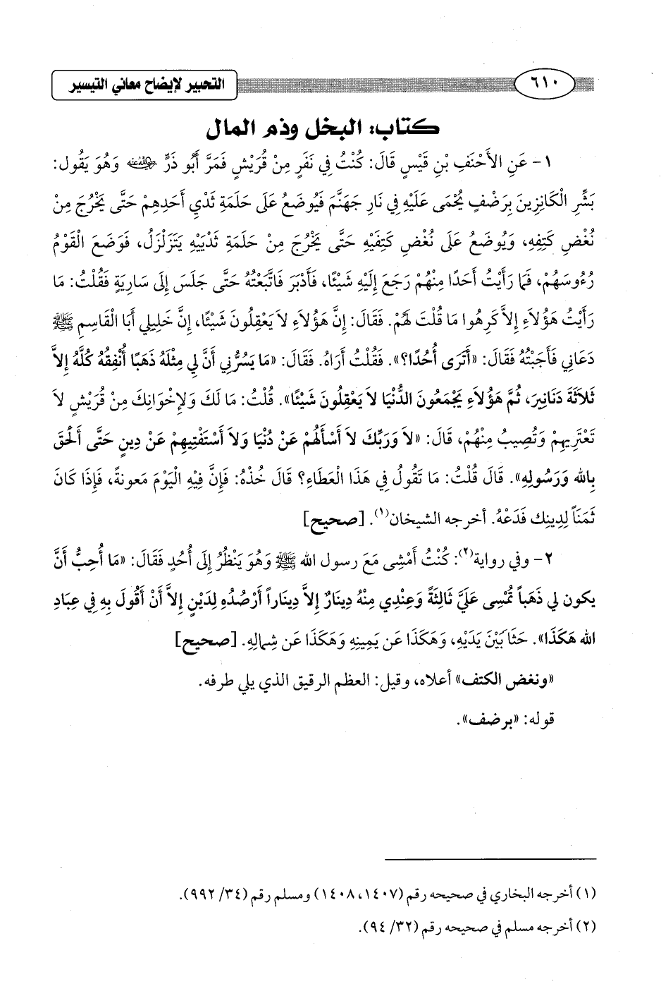 1 - عَنِ الأَحْنَفِ بْنِ قَيْسٍ قَالَ: كُنْتُ فِي نَفَرٍ مِنْ قُرَيْشٍ فَمَرَّ أَبُو ذَرٍّ - رضي الله عنه - وَهُوَ يَقُول: بَشِّرِ الْكَانِزِينَ بِرَضْفٍ يُحْمَى عَلَيْهِ فِي نَارِ جَهَنَّمَ فَيُوضَعُ عَلَى حَلَمَةِ ثَدْيِ أَحَدِهِمْ حَتَّى يَخْرُجَ مِنْ نُغْضِ كَتِفِهِ، وَيُوضَعُ عَلَى نُغْضِ كَتِفَيْهِ حَتَّى يَخْرُجَ مِنْ حَلَمَةِ ثَدْيَيْهِ يَتَزَلْزَلُ، فَوَضَعَ الْقَوْمُ رُءُوسَهُمْ، فَمَا رَأَيْتُ أَحَدًا مِنْهُمْ رَجَعَ إِلَيْهِ شَيْئًا، فَأَدْبَرَ فَاتَّبَعْتُهُ حَتَّى جَلَسَ إِلَى سَارِيَةٍ فَقُلْتُ: مَا رَأَيْتُ هَؤُلاَءِ إِلاَّ كَرِهُوا مَا قُلْتَ لَهُمْ. فَقَالَ: إِنَّ هَؤُلاَءِ لاَ يَعْقِلُونَ شَيْئًا، إِنَّ خَلِيِلي أَبَا الْقَاسِمِ - صلى الله عليه وسلم - دَعَانِي فَأَجَبْتُهُ فَقَالَ: "أَتَرَى أُحُدًا؟ ". فَقُلْتُ أَرَاهُ. فَقَالَ: "مَا يَسُرُّنِي أَنَّ لِي مِثْلَهُ ذَهَبًا أُنْفِقُهُ كُلَّهُ إِلاَّ ثَلاَثَةَ دَنَانِيرَ، ثُمَّ هَؤُلاَءِ يَجْمَعُونَ الدُّنْيَا لاَ يَعْقِلُونَ شَيْئًا". قُلْتُ: مَا لَكَ وَلإِخْوَانِكَ مِنْ قُرَيْشٍ لاَ تَعْتَريهِمْ وَتُصِيبُ مِنْهُمْ، قَالَ: "لاَ وَرَبِّكَ لاَ أَسْأَلهُمْ عَنْ دُنْيَا وَلاَ أَسْتَفْتِيهِمْ عَنْ دِينٍ حَتَّى أَلْحَقَ بِالله وَرَسُولِهِ". قَالَ قُلْتُ: مَا تَقُولُ فِي هَذَا الْعَطَاءِ؟ قَالَ خُذْهُ: فَإِنَّ فِيْهِ الْيَوْمَ مَعونةً، فَإِذَا كَانَ ثَمَنَاً لِدِينِك فَدَعْهُ. أخرجه الشيخان (¬1). [صحيح]
