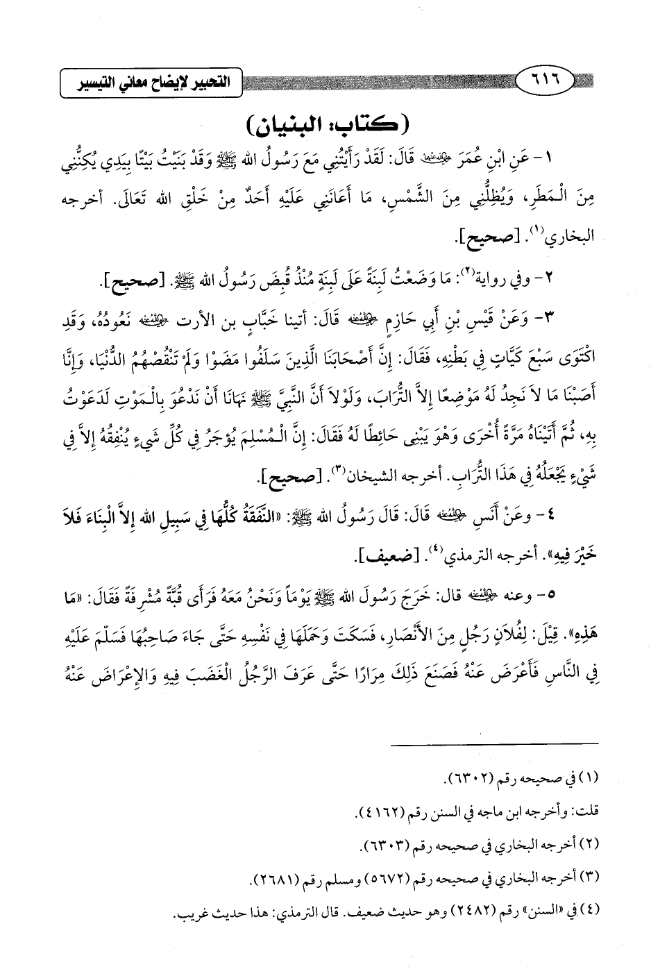 4 - وعَنْ أَنَسِ - رضي الله عنه - قَالَ: قَالَ رَسُولُ الله - صلى الله عليه وسلم -: "النَّفَقَةُ كُلُّهَا فِي سَبِيلِ الله إِلاَّ الْبِنَاءَ فَلاَ خيْرَ فِيهِ". أخرجه الترمذي (¬4). [ضعيف].