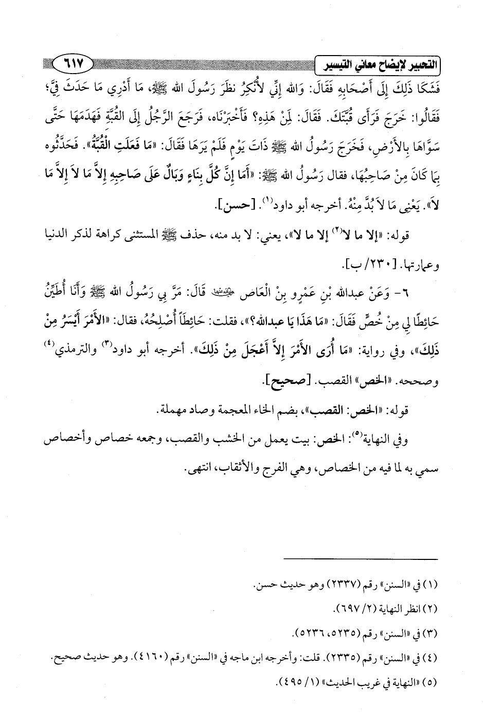 6 - وَعَنْ عبد الله بْنِ عَمْرٍو بِنْ الْعَاص - رضي الله عنهما - قَالَ: مَرَّ بِي رَسُولُ الله - صلى الله عليه وسلم - وَأَنَا أُطَيِّنُ حَائِطًا لِي مِنْ خُصٍّ فَقَالَ: "مَا هَذَا يَا عبد الله؟ "، فقلت: حَائِطَاً أُصْلِحُهُ، فقال: "الأَمْرَ أَيْسَرُ مِنْ ذَلِكَ"، وفي رواية: "مَا أُرَى الأَمْرَ إِلاَّ أَعْجَلَ مِنْ ذَلِكَ". أخرجه أبو داود (¬3) والترمذي (¬4) وصححه. "الخص" القصب. [صحيح].