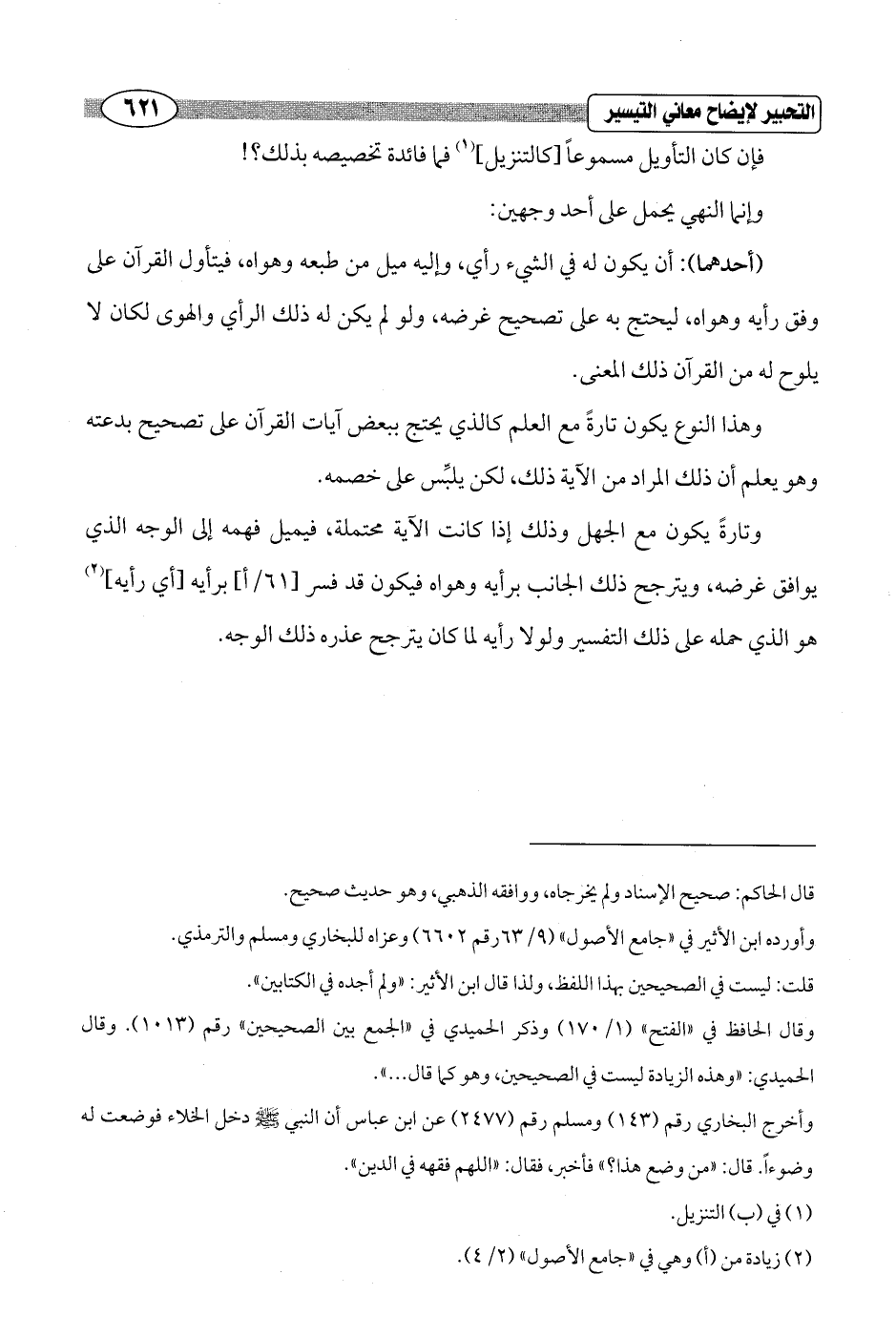 وتارةً يكون مع الجهل وذلك إذا كانت الآية محتملة، فيميل فهمه إلى الوجه الذي يوافق غرضه، ويترجح ذلك الجانب برأيه وهواه فيكون قد فسر [61/ أ] برأيه [أي رأيه] (¬2) هو الذي حمله على ذلك التفسير ولولا رأيه لما كان يترجح عذره ذلك الوجه.