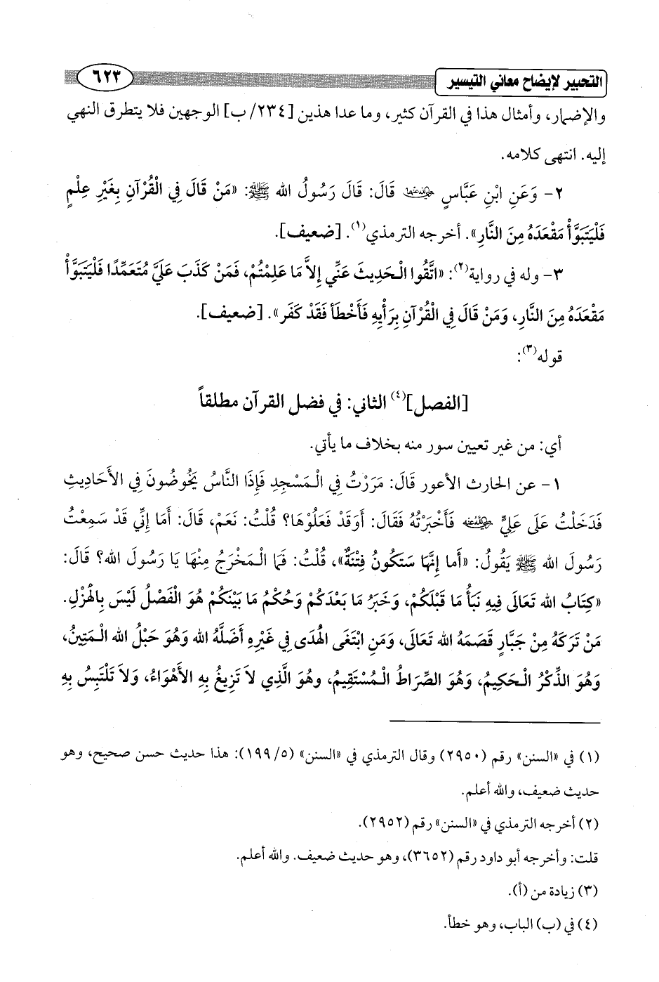 2 - وَعَنِ ابْنِ عَبَّاسٍ - رضي الله عنهما - قَالَ: قَالَ رَسُولُ الله - صلى الله عليه وسلم -: "مَنْ قَالَ فِي الْقُرْآنِ بِغَيْرِ عِلْمٍ فَلْيَتبَوَّأْ مَقْعَدَهُ مِنَ النَّارِ". أخرجه الترمذي (¬1). [ضعيف].