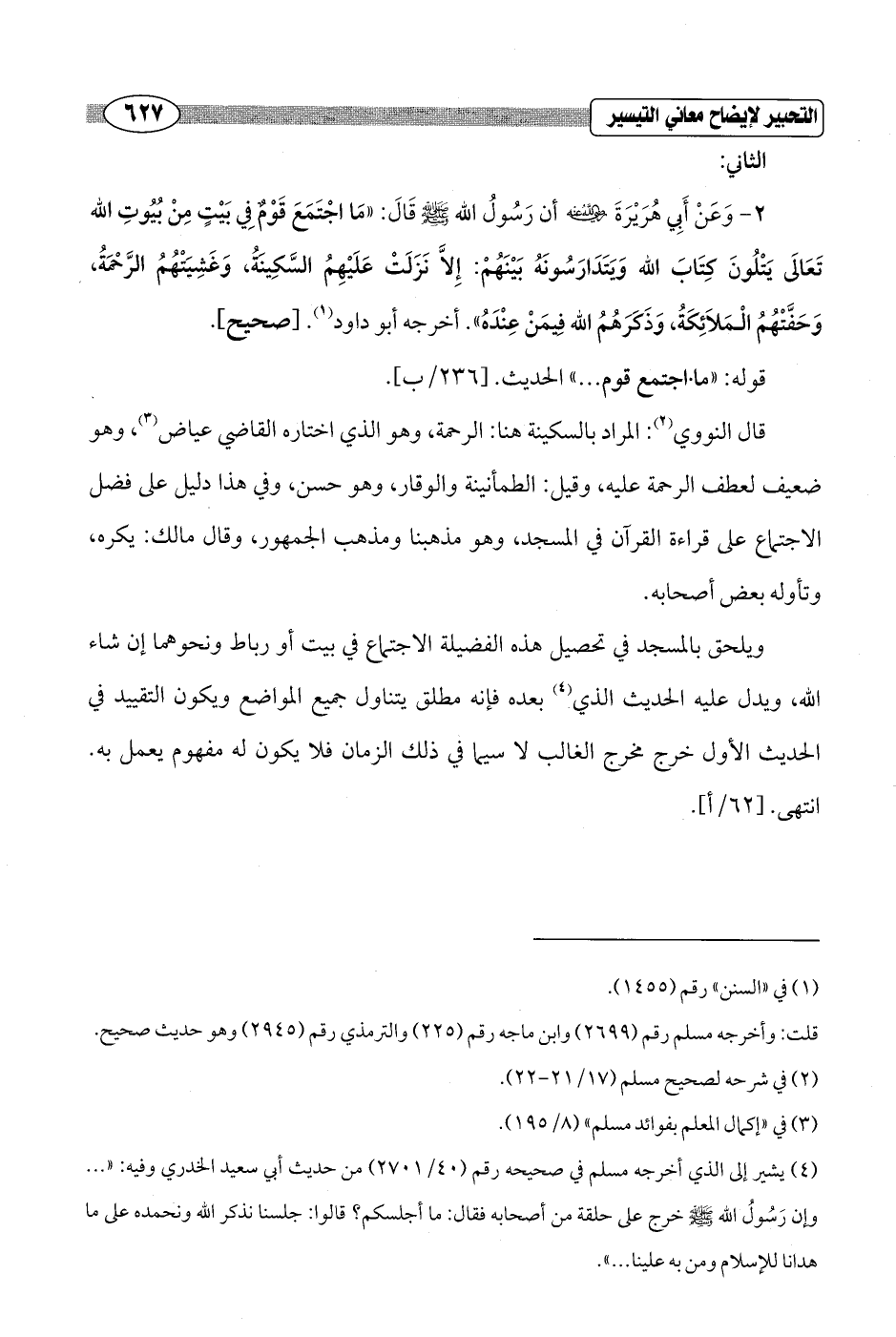 2 - وَعَنْ أَبِي هُرَيْرَةَ - رضي الله عنه - أن رَسُولُ الله - صلى الله عليه وسلم - قَالَ: "مَا اجْتَمَعَ قَوْمٌ فِي بَيْتٍ مِنْ بُيُوتِ الله تَعَالَى يَتْلُونَ كِتَابَ الله وَيَتَدَارَسُونَهُ بَيْنَهُمْ: إِلاَّ نَزَلَتْ عَلَيْهِمُ السَّكِينةُ, وَغَشِيَتْهُمُ الرَّحْمَةُ, وَحَفَّتْهُمُ الْمَلاَئِكَةُ، وَذَكَرَهُمُ الله فِيمَنْ عِنْدَهُ". أخرجه أبو داود (¬1). [صحيح].