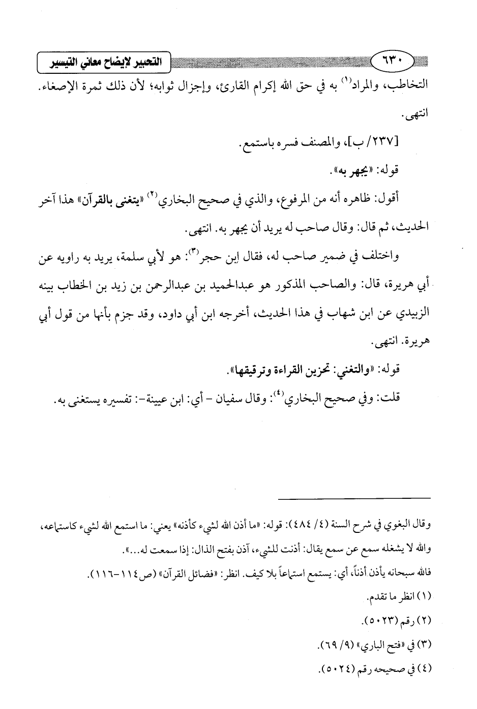 أقول: ظاهره أنه من المرفوع، والذي في صحيح البخاري (¬2) "يتغنى بالقرآن" هذا آخر الحديث، ثم قال: وقال صاحب له يريد أن يجهر به. انتهى.