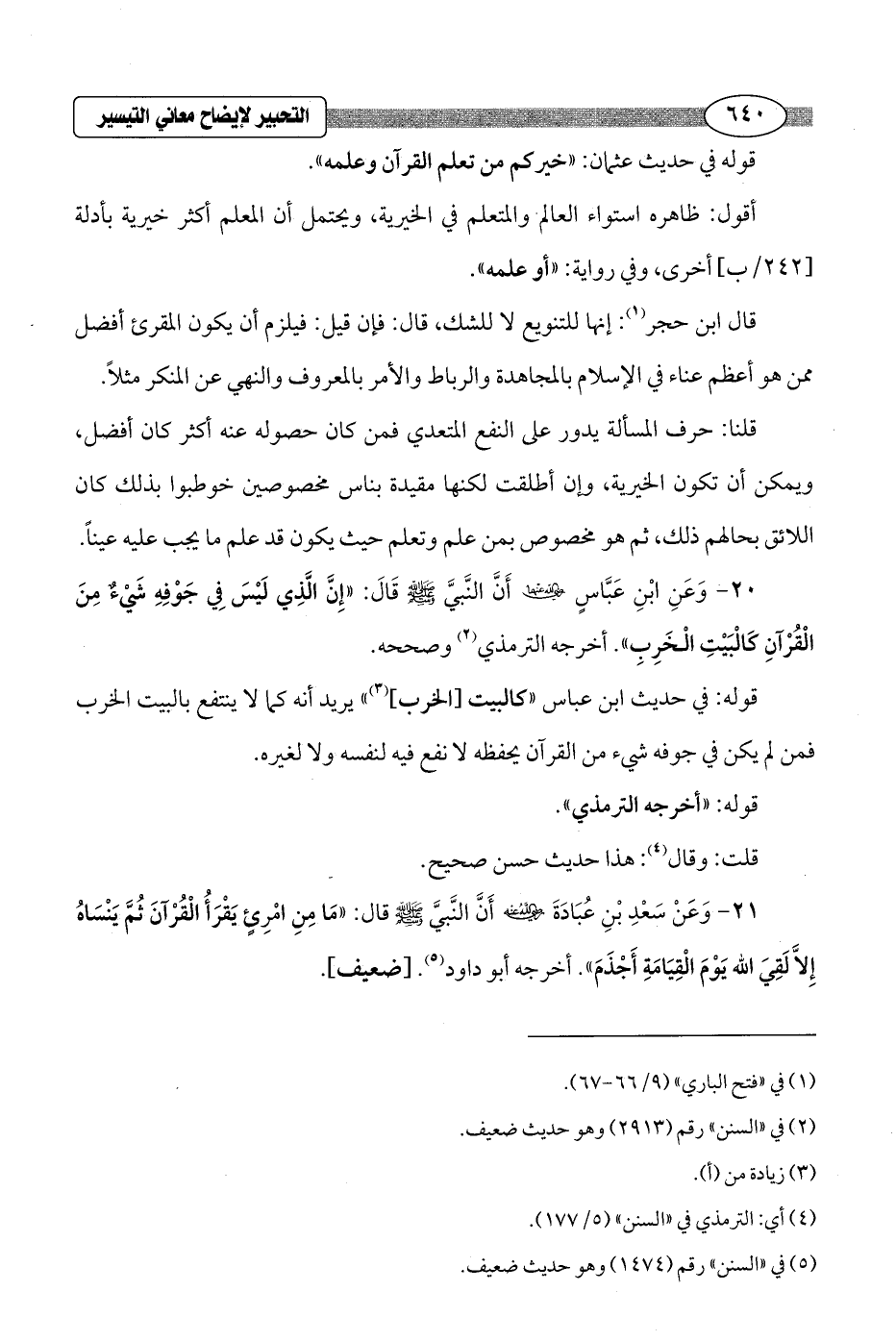 20 - وَعَنِ ابْنِ عَبَّاسٍ - رضي الله عنهما - أَنَّ النَّبيَّ - صلى الله عليه وسلم - قَالَ: "إِنَّ الَّذِي لَيْسَ فِي جَوْفِهِ شَيْءٌ مِنَ الْقُرْآنِ كَالْبَيْتِ الْخَرِب". أخرجه الترمذي (¬2) وصححه.