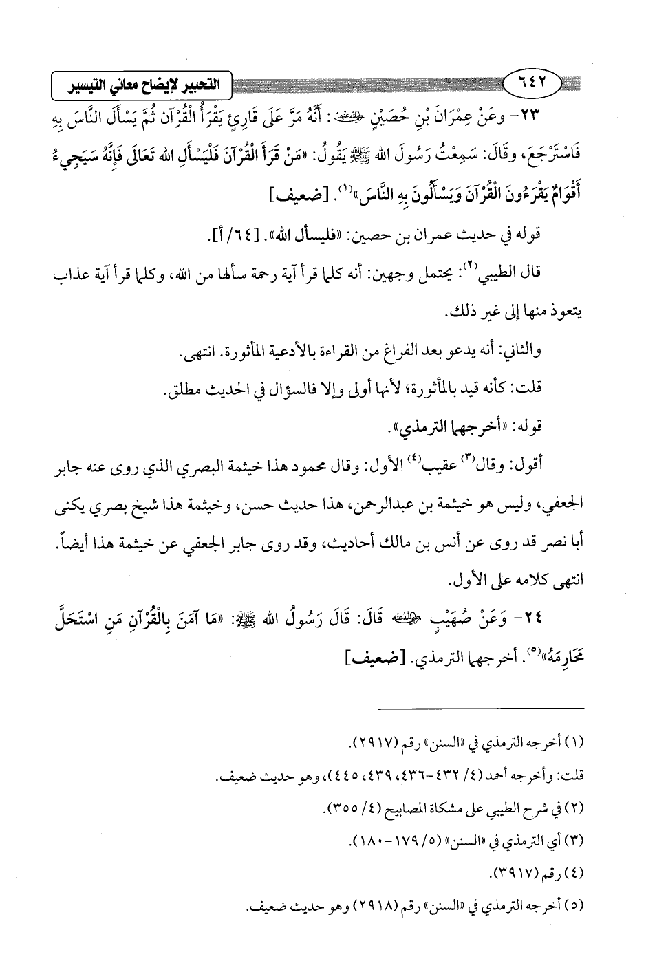 23 - وعَنْ عِمْرَانَ بْنِ حُصَيْنٍ - رضي الله عنهما -: أَنَّهُ مَرَّ عَلَى قَارِئٍ يَقْرَأُ الْقُرْآن ثُمَّ يَسْأَل النَّاسَ بِهِ فَاسْتَرْجَعَ، وقَالَ: سَمِعْتُ رَسُولَ الله - صلى الله عليه وسلم - يَقُولُ: "مَنْ قَرَأَ الْقُرْآنَ فَلْيَسْأَلِ الله تَعَالَى فَإِنَّهُ سَيَجِيءُ أَقْوَامٌ يَقْرَءُونَ الْقُرْآنَ وَيَسْأَلُونَ بِهِ النَّاسَ" (¬1). [ضعيف]