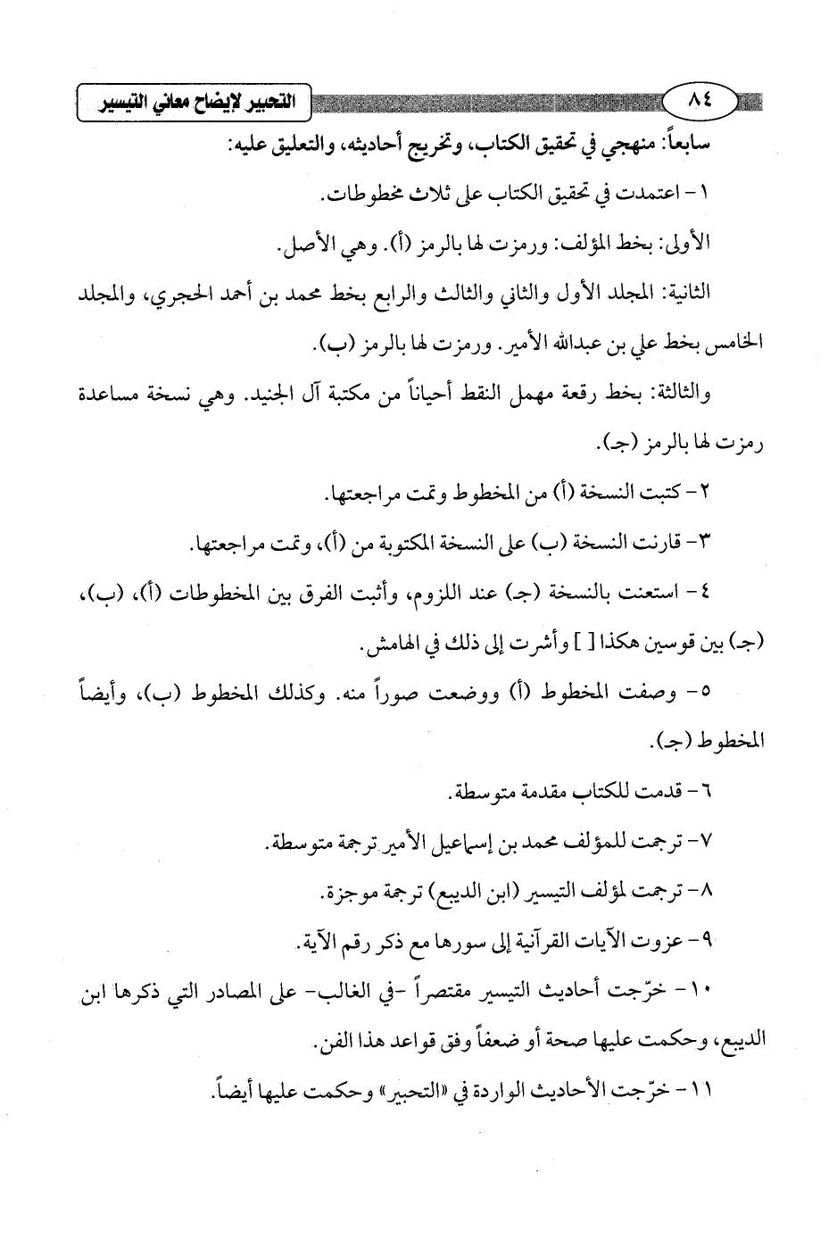 10 - خرّجت أحاديث التيسير مقتصراً - في الغالب - على المصادر التي ذكرها ابن الديبع، وحكمت عليها صحة أو ضعفاً وفق قواعد هذا الفن.