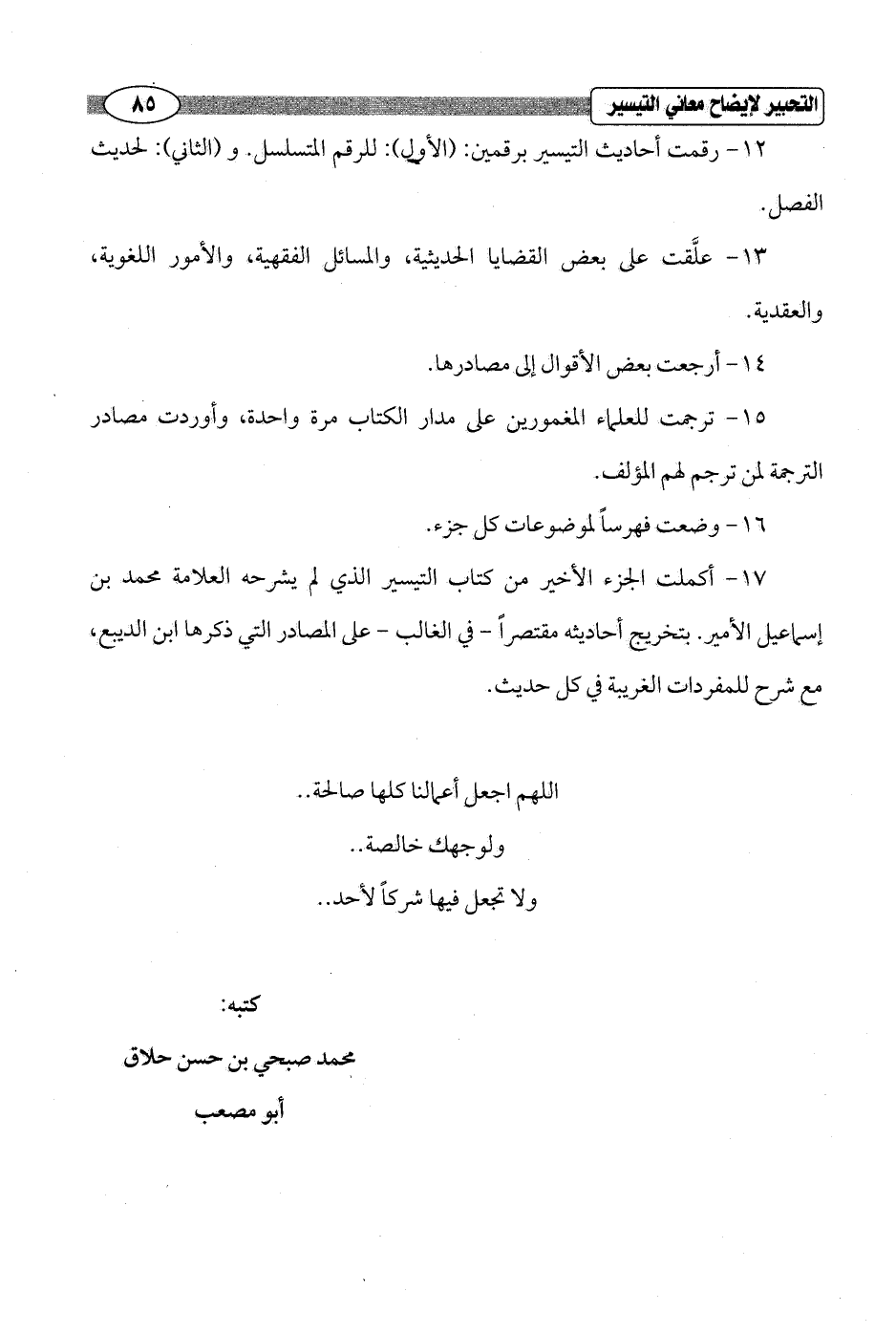 17 - أكملت الجزء الأخير من كتاب التيسير الذي لم يشرحه العلامة محمد بن إسماعيل الأمير. بتخريج أحاديثه مقتصراً - في الغالب - على المصادر التي ذكرها ابن الديبع، مع شرح للمفردات الغريبة في كل حديث.