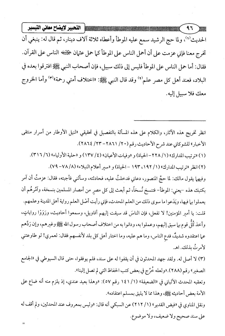 وفيهما يقول مالك: لما حجَّ المنصور، دعاني فدخلتُ عليه, فحادثته, وسألني فأجبته، فقال: عزمتُ أن آمر بكتبك هذه - يعني: الموطأ - فتنسخ نُسخاً، ثم أبعث إلى كل مصرٍ من أمصار المسلمين بنسخة، وآمُرهُم أن يعملوا بما فيها، ويَدَعوا ما سوى ذلك من العلم المحدث، فإني رأيت أصْل العلم رواية أهل المدينة وعلمهم. قلت: يا أمير المؤمنين! لا تفعل، فإن الناسَ قد سيقت إليهم أقاويل، وسمعوا أحاديث، ورَوَوْا رواياتٍ، وأخذ كُلُّ قوم بما سيق إليهم، وعملوا به، ودانوا به من اختلاف أصحاب رسول الله - صلى الله عليه وسلم - وغيرهم، وإن رَدَّهم عما اعتقدوه شديدٌ، فدعِ الناس، وما هم عليه, وما اختار أهل كل بلد لأنفسهم فقال: لعمري! لو طاوعتني لأمرتُ بذلك. اهـ.