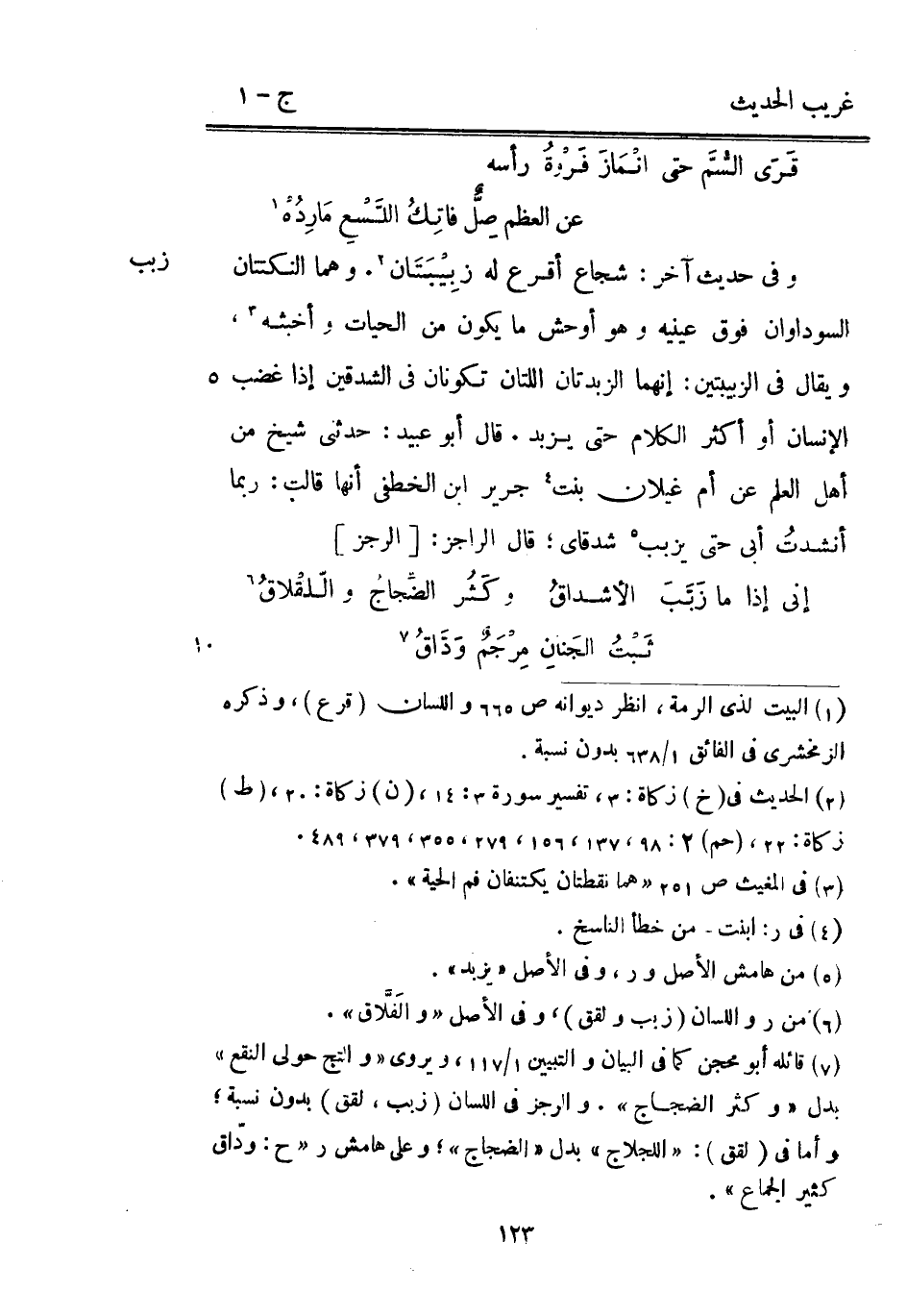 وَفِي حَدِيث آخر: شُجَاع أَقرع لَهُ زَبِيبَتَانِ. وهما النكتتان السوداوان فَوق عَيْنَيْهِ وَهُوَ أوحش مَا يكون من الْحَيَّات وأخبثه وَيُقَال فِي الزبيبتين: إنَّهُمَا الزبدتان اللَّتَان تَكُونَانِ فِي الشدقين إِذا غضب الْإِنْسَان أَو أَكثر الْكَلَام حَتَّى يُزْبِد. قَالَ أَبُو عبيد: حَدَّثَنِي شيخ من أهل الْعلم عَن أم غيلَان بِنْت جرير ابْن الخطفي أَنَّهَا قَالَتْ: رُبمَا أنشدتُ أبي حَتَّى يزبب شدقاي قَالَ الراجز: [الرجز]