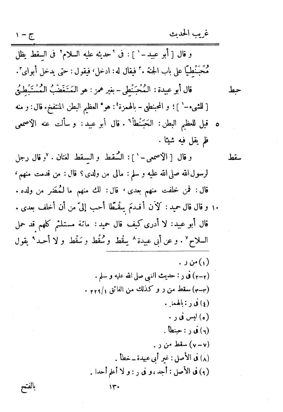 حَبط وَقَالَ [أَبُو عُبَيْد -] : فِي حَدِيثه عَلَيْهِ السَّلَام فِي السِقط يظل محبنطيا لى بَاب الْجنَّة. فَيُقَال لَهُ: ادخل فَيَقُول: حَتَّى يدْخل أبواي. قَالَ أَبُو عُبَيْدَة: المُحْبَنْطِي - بِغَيْر همز: هُوَ المتغضب المستبطئ [للشَّيْء -] والمحبنطئ - بِالْهَمْزَةِ: هُوَ الْعَظِيم الْبَطن المنتفخ. قَالَ: وَمِنْه قيل للعظيم الْبَطن: الحبنطأ.