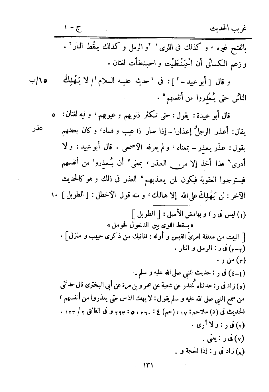 عذر وَقَالَ [أَبُو عبيد -] : فِي حَدِيثه عَلَيْهِ السَّلَام / لَا يهْلك 15 / ب الناسُ حَتَّى يُعْذِروا من أنفسهم. قَالَ أَبُو عُبَيْدَة: يَقُول: حَتَّى تكْثر ذنوبهم وعيوبهم وَفِيه لُغَتَانِ: يُقَال: أعذر الرجل إعذارا - إِذا صَار ذَا عيب وَفَسَاد وَكَانَ بَعضهم يَقُول: عذَر يعذِر - بِمَعْنَاهُ وَلم يعرفهُ الْأَصْمَعِي. قَالَ أَبُو عُبَيْدٍ: وَلَا أَدْرِي هَذَا أَخذ إِلَّا من الْعذر بِمَعْنى أَن يُعذِروا من أنفسهم فيستوجبوا الْعقُوبَة فَيكون لمن يعذبهم الْعذر فِي ذَلِك وَهُوَ كالحديث الآخر: لن يَهْلِكَ على اللَّه إِلَّا هَالك وَمِنْه قَول الأخطل: [الطَّوِيل]