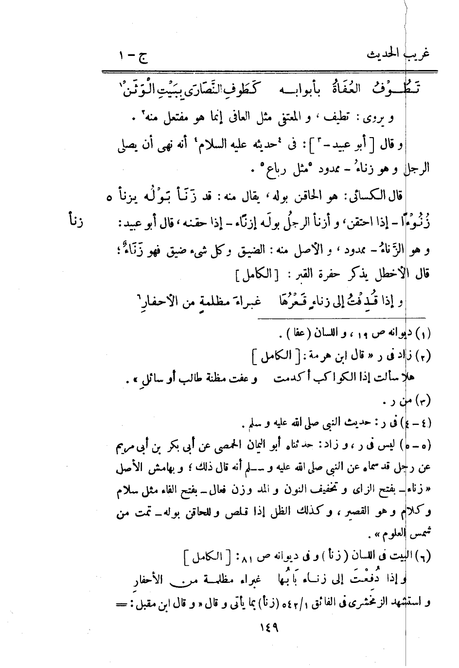 ويروى: تطيف والمعتفى مثل الْعَافِي إِنَّمَا هُوَ مفتعل مِنْهُ. وَقَالَ [أَبُو عُبَيْد -] : فِي حَدِيثه عَلَيْهِ السَّلَام أَنه نهى أَن يُصَلِّي الرجل وَهُوَ زناءُ - مَمْدُود مثل رباع. قَالَ الْكسَائي: هُوَ الحاقن بَوْله يُقَال مِنْهُ: قد زَنَأ بَوْلُه يزنأ زُنُوْءاً - إِذا احتقن وأزنأ الرجل بَوْله إزناء - إِذا حقنه