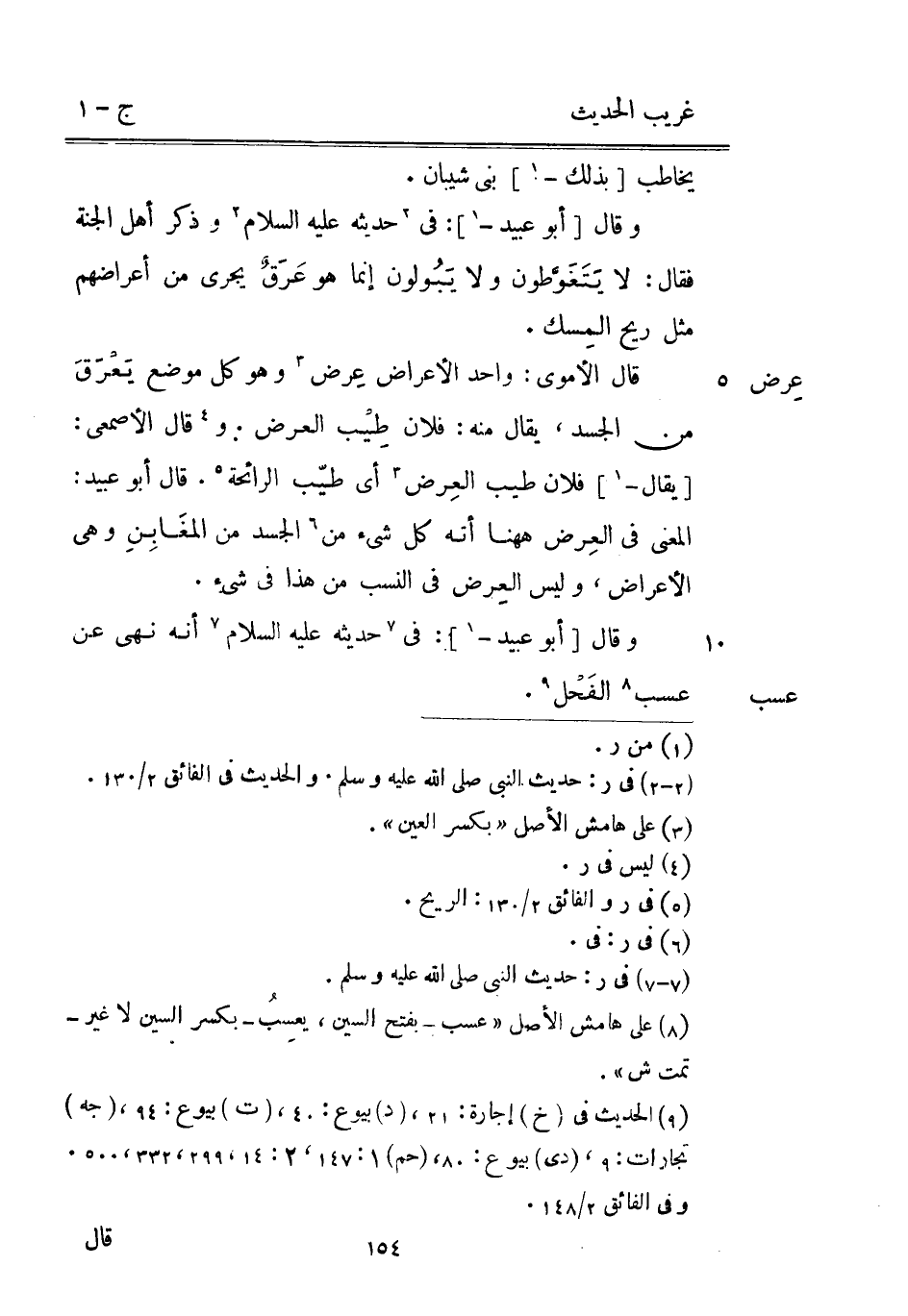 عرض وَقَالَ [أَبُو عبيد -] : فِي حَدِيثه عَلَيْهِ السَّلَام وَذكر أهل الْجنَّة فَقَالَ: لَا يَتَغَوَّطون وَلَا يَبُولون إِنَّمَا هُوَ عَرَقٌ يجْرِي من أعراضهم مثل ريح المِسك. قَالَ الْأمَوِي: وَاحِد الْأَعْرَاض عِرض وَهُوَ كل مَوضِع يَعْرَقَ من الْجَسَد يُقَال مِنْهُ: فلَان طيب العِرض. وقَالَ الْأَصْمَعِي: [يُقَال -] فلَان طيب العِرض أَي طيب الرَّائِحَة. قَالَ أَبُو عُبَيْدٍ: المعني فِي العِرض هَهُنَا أَنه كل شَيْء من الْجَسَد من المغَابِنِ وَهِي الْأَعْرَاض وَلَيْسَ العِرض فِي النّسَب من هَذَا فِي شَيْء.