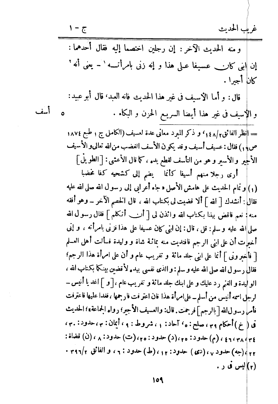 وَمِنْه الحَدِيث الآخر: إِن رجلَيْنِ اخْتَصمَا إِلَيْهِ فَقَالَ أَحدهمَا: إِن ابْني كَانَ عسيفًا على هَذَا وَإنَّهُ زنى بامرأته - يَعْنِي أَنه كَانَ أَجِيرا. قَالَ: وَأما الأسيف فِي غير هَذَا الحَدِيث فَإِنَّهُ العَبْد