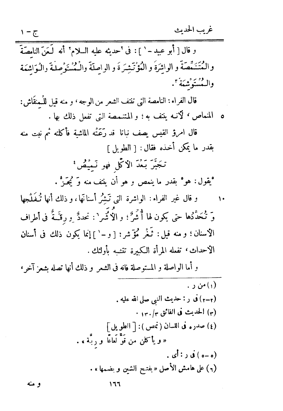 وَقَالَ [أَبُو عُبَيْد -] : فِي حَدِيثه عَلَيْهِ السَّلَام أَنه لَعَنَ النامِصَةَ والمُتَنَمِّصَةَ والواشِرَةَ والمُؤْتَشِرَةَ والواصِلَةَ والْمُسْتَوْصِلةَ والْوَاشِمَة والمُسْتَوْشِمَة. قَالَ الْفراء: النامصة الَّتِي تنتف الشّعْر من الْوَجْه وَمِنْه قيل للْمِنقَاش: المنماص لِأَنَّهُ ينتف بِهِ والمتنمصة الَّتِي تفعل ذَلِك بهَا. قَالَ امْرُؤ الْقَيْس يصف نباتا قد رَعَتْه الْمَاشِيَة فأكلته ثُمَّ نبت مِنْهُ بِقدر مَا يُمكن أَخذه فَقَالَ: [الطَّوِيل]