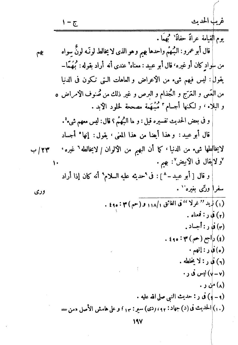 يَوْم الْقِيَامَة عُرَاة حُفَاة بهما. قَالَ أَبُو عَمْرو: البهم وَاحِدهَا بهيم وَهُوَ الَّذِي لَا يخالط لَونه لون سواهُ من سَواد كَانَ أَو غَيره قَالَ أَبُو عُبَيْدٍ: مَعْنَاهُ عِنْدِي أَنه أَرَادَ بقوله: بهما - يَقُول: لَيْسَ فيهم شَيْء من الْأَعْرَاض والعاهات الَّتِي تكون فِي الدُّنْيَا من الْعَمى وَالْعَرج والجذام والبرص وَغير ذَلِك من صنوف الْأَمْرَاض وَالْبَلَاء وَلكنهَا أجسام مُبْهمَة مصححة لخلود الْأَبَد. وَفِي بعض الحَدِيث تَفْسِيره قيل: وَمَا البهم قَالَ: لَيْسَ مَعَهم شَيْء. قَالَ أَبُو عُبَيْد: وَهَذَا أَيْضا من هَذَا الْمَعْنى يَقُول: أَنَّهَا أجساد لَا يخالطها شَيْء من الدُّنْيَا كَمَا أَن البهيم من الألوان / لَا يخالطه غَيره 23 / ب وَلَا يُقَال فِي الْأَبْيَض: بهيم.