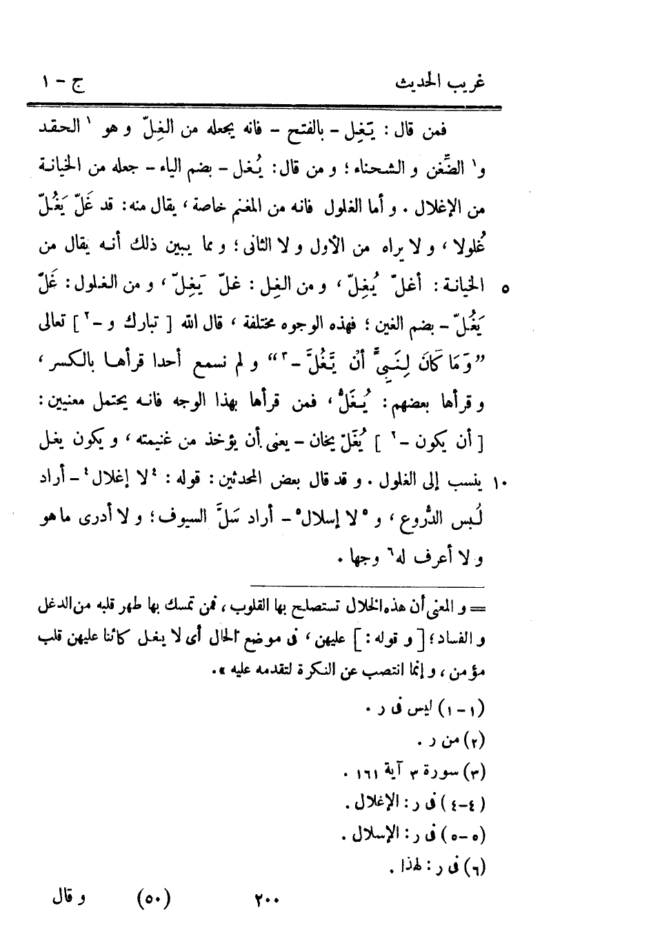 فَمن قَالَ: يَغِل - بِالْفَتْح - فَإِنَّهُ يَجعله من الغِلّ وَهُوَ الحقد والضغن والشحناء وَمن قَالَ: يغل - بِضَم الْيَاء - جعله من الْخِيَانَة من الإغلال. وَأما الْغلُول فَإِنَّهُ من الْمغنم خَاصَّة يُقَال مِنْهُ: قد غَلّ يَغُلّ غُلولا وَلَا يرَاهُ من الأول وَلَا الثَّانِي وَمِمَّا يبين ذَلِك أَنه يُقَال من الْخِيَانَة: أغل يُغِلّ وَمن الغِل: غل يغل وَمن الْغلُول: غَلّ يَغُلّ - بِضَم الْغَيْن فَهَذِهِ الْوُجُوه مُخْتَلفَة قَالَ الله [تبَارك و -] تَعَالَى {وَمَا كَانَ لِنَبِيٍّ أنْ يَّغُلَّ} وَلم نسْمع أحدا قَرَأَهَا بِالْكَسْرِ وَقرأَهَا بَعضهم: يُغَلُّ فَمن قَرَأَهَا بِهَذَا الْوَجْه فَإِنَّهُ يحْتَمل مَعْنيين: [أَن يكون -] يُغَلّ يخان - يَعْنِي أَن يُؤْخَذ من غنيمته وَيكون يغل ينْسب إِلَيّ الْغلُول. وَقد قَالَ بعض الْمُحدثين: قَوْله: لَا إِغْلَال - أَرَادَ لبس الدروع ولَا إِسْلَال - أَرَادَ سل السيوف وَلَا أَدْرِي مَا هُوَ وَلَا أعرف لَهُ وَجها.