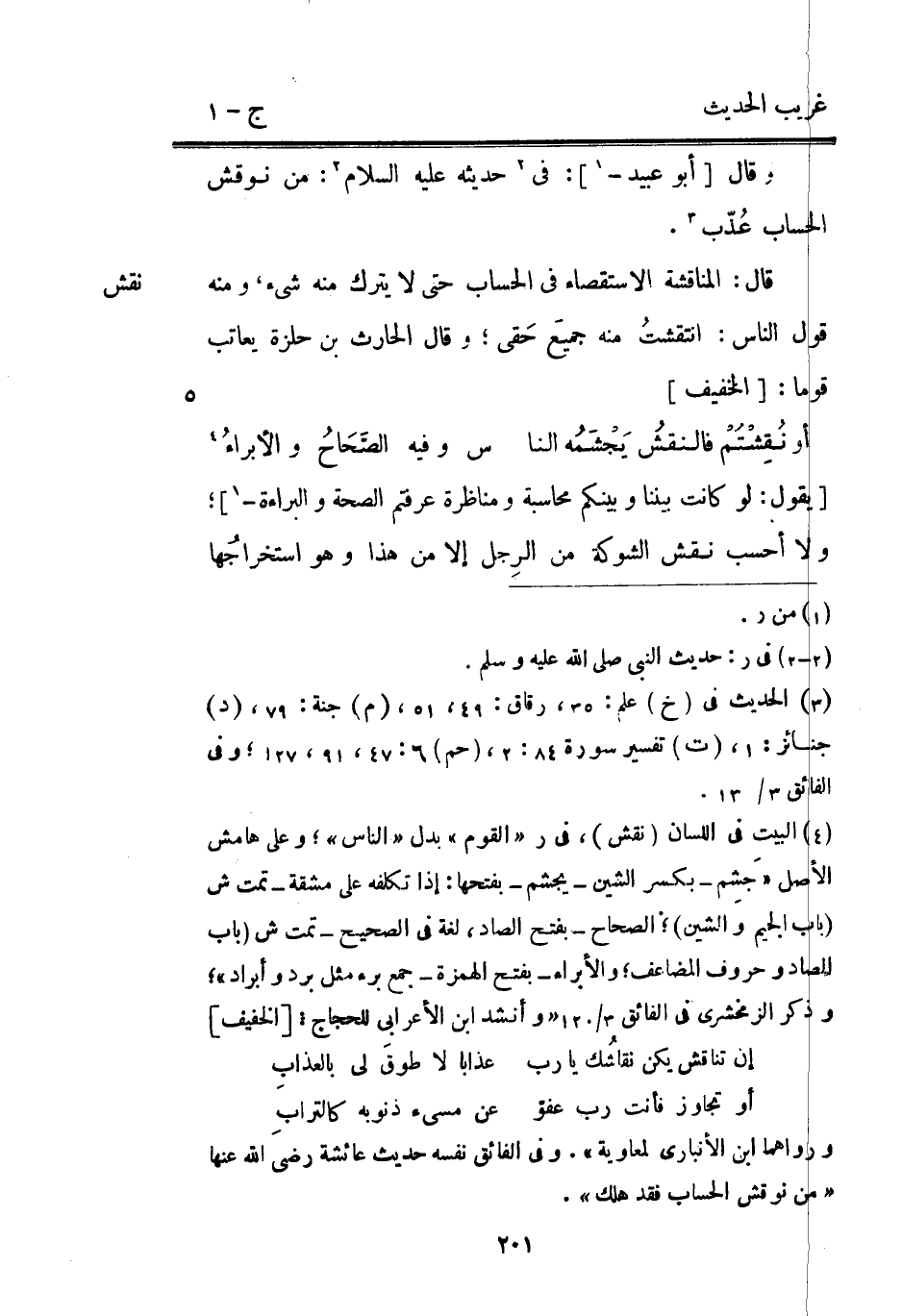 نقش وَقَالَ [أَبُو عُبَيْد -] : فِي حَدِيثه عَلَيْهِ السَّلَام: من نُوقِشَ الْحساب عذب. قَالَ: المناقشة الِاسْتِقْصَاء فِي الْحساب حَتَّى لَا يتْرك مِنْهُ شَيْء وَمِنْه قَول النَّاس: انتقشت مِنْهُ جَمِيع حَقي وَقَالَ الْحَارِث بْن حلزة يُعَاتب قوما: [الْخَفِيف]