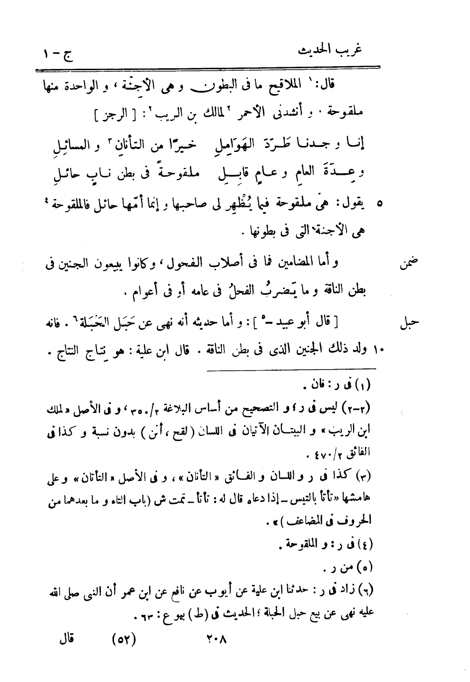 يَقُول: هِيَ ملقوحة فِيمَا يُظهر لي صَاحبهَا وَإِنَّمَا أمهَا حَائِل فالملقوحة هِيَ الأجنة الَّتِي فِي بطونها. وَأما المضامين فَمَا فِي أصلاب الفحول وَكَانُوا يبيعون الْجَنِين فِي بطن النَّاقة وَمَا يضْرب الْفَحْل فِي عَامه أَو فِي أَعْوَام. [قَالَ أَبُو عبيد -] : وَأما حَدِيثه أَنه نهى عَن حَبل الحبلة. فَإِنَّهُ ولد ذَلِك الْجَنِين الَّذِي فِي بطن النَّاقة. قَالَ ابْن علية: هُوَ نتاج النِّتَاج.