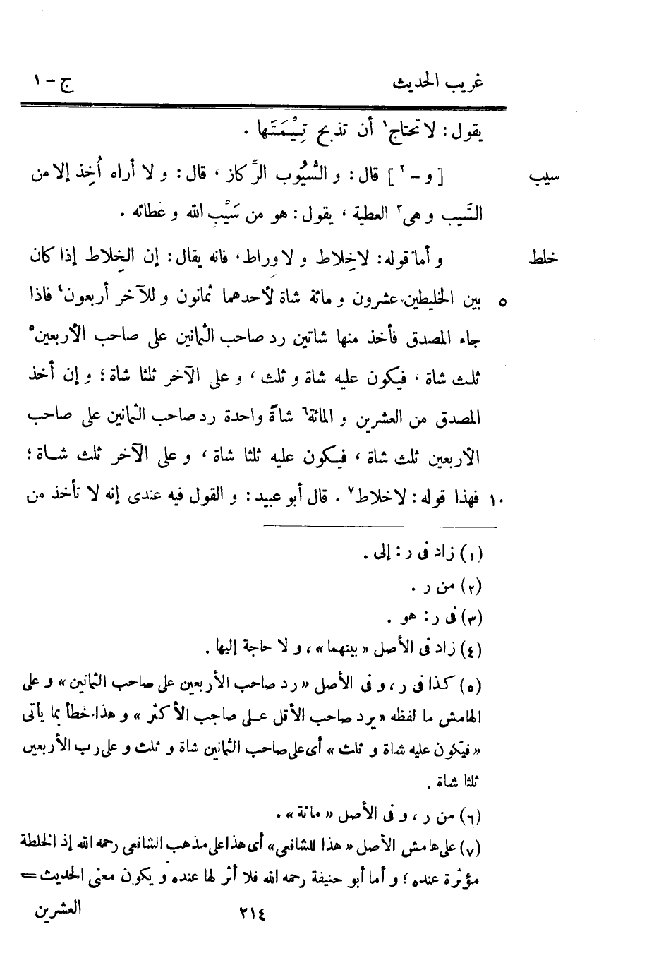 يَقُول: لَا تحْتَاج أَن تذبح تيمتها. [و -] قَالَ: والسيوب الرِّكَاز قَالَ: وَلَا أرَاهُ أَخذ إِلَّا من السيب وَهِي الْعَطِيَّة يَقُول: هُوَ من سيب اللَّه وعطائه. وَأما قَوْله: لَا خِلاط وَلَا وراط فَإِنَّهُ يُقَال: إِن الخلاط إِذا كَانَ بَين الخليطين عشرُون وَمِائَة شَاة لأَحَدهمَا ثَمَانُون وَللْآخر أَرْبَعُونَ فَإِذا جَاءَ الْمُصدق فَأخذ مِنْهَا شَاتين رد صَاحب الثَّمَانِينَ على صَاحب الْأَرْبَعين ثلث شَاة. فَيكون عَلَيْهِ شَاة وَثلث وعَلى الآخر ثلثا شَاة وَإِن أَخذ الْمُصدق من الْعشْرين وَالْمِائَة شَاة وَاحِدَة رد صَاحب الثَّمَانِينَ على صَاحب الْأَرْبَعين ثلث شَاة فَيكون عَلَيْهِ ثلثا شَاة وَعلي الآخر ثلث شَاة فَهَذَا قَوْله: لَا خلاط.