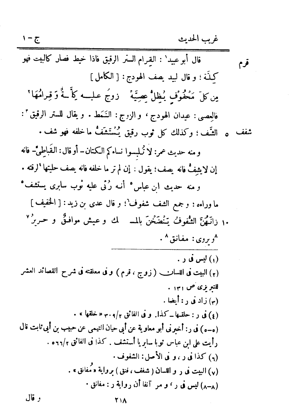 فالعصي: عيدَان الهودج وَالزَّوْج: النمط. وَيُقَال للستر الرَّقِيق: الشف وَكَذَلِكَ كل ثوب رَقِيق يسْتَشف مَا خَلفه فَهُوَ شف. وَمِنْه حَدِيث عُمَر: لَا تلبسوا نساءكم الْكَتَّان - أَو قَالَ: الْقبَاطِي - فَإِنَّهُ إِن لَا يشف فَإِنَّهُ يصف: يَقُول: إِن لم تَرَ مَا خَلفه فَإِنَّهُ يصف حليتها لرقته. وَمِنْه حَدِيث ابْن عَبَّاس أَنه رئى عَلَيْهِ ثوب سابري يسْتَشف مَا رواءه وَجمع الشف شفوف وَقَالَ عدي بن زيد: [الْخَفِيف]