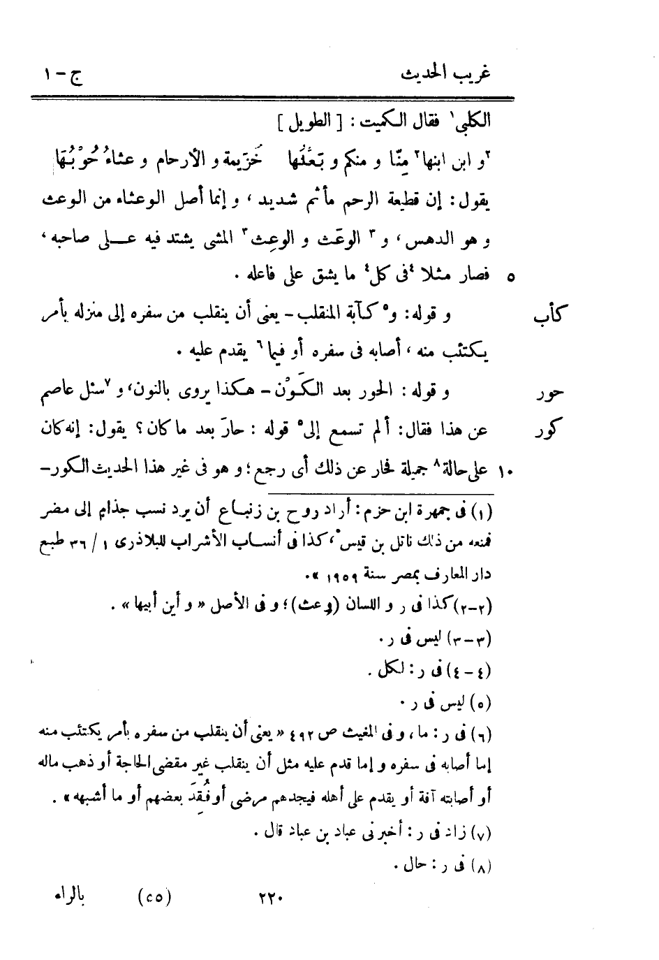 يَقُول: إِن قطيعة الرَّحِم مأثم شَدِيد وَإِنَّمَا أصل الوعثاء من الوعث وَهُوَ الدهس والوعث والوعِث الْمَشْي يشْتَد فِيهِ على صَاحبه فَصَارَ مثلا فِي كل مَا يشق على فَاعله. وَقَوله: وكآبة المنقلب - يَعْنِي أَن يَنْقَلِب من سَفَره إِلَى منزله بِأَمْر يكتئب مِنْهُ أَصَابَهُ فِي سَفَره أَو فِيمَا يقدم عَلَيْهِ. وَقَوله: الْحور بعد الْكَوْن - هَكَذَا يرْوى بالنُّون وسُئِلَ عَاصِم عَن هَذَا فَقَالَ: ألم تسمع إِلَى قَوْله: حَار بعد مَا كَانَ يَقُول: إِنَّه كَانَ على حَالَة جميلَة فحار عَن ذَلِك أَي رَجَعَ وَهُوَ فِي غير هَذَا الحَدِيث الكور -