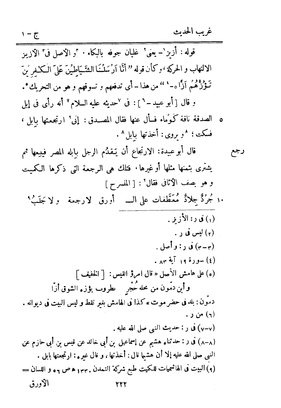 رَجَعَ وَقَالَ [أَبُو عُبَيْد -] : فِي حَدِيثه عَلَيْهِ السَّلَام أَنه رأى فِي إبل الصَّدَقَة نَاقَة كوماء فَسَأَلَ عَنْهَا فَقَالَ الْمُصدق: إِنِّي ارتجعتها بابل فَسكت ويروي: أَخَذتهَا بابل. قَالَ أَبُو عُبَيْدَة: الارتجاع أَن يقدم الرجل بإبله الْمصر فيبيعها ثُمَّ يَشْتَرِي بِثمنِهَا مثلهَا أَو غَيرهَا فَتلك هِيَ الرّجْعَة الَّتِي ذكرهَا الْكُمَيْت وَهُوَ يصف الأثافي فَقَالَ: [المنسرح]