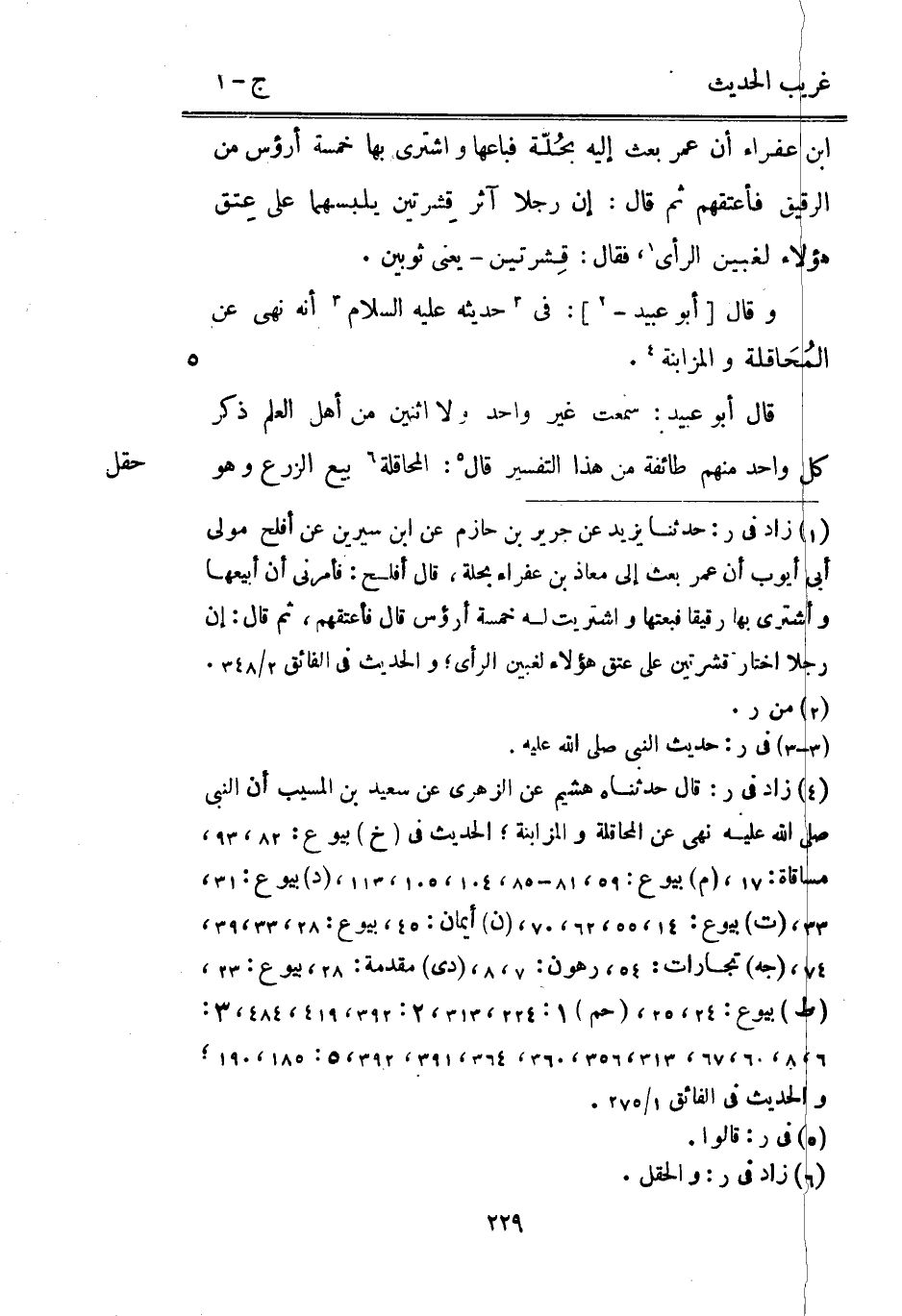 ابْن عفراء أَن عُمَر بعث إِلَيْهِ بحلة فَبَاعَهَا وَاشْترى بهَا خَمْسَة أرؤس من الرَّقِيق فَأعْتقهُمْ ثُمَّ قَالَ: إِن رجلا آثر قشرتين يَلْبسهُمَا على عتق هَؤُلَاءِ لغبين الرَّأْي فَقَالَ: قشرتين - يَعْنِي ثَوْبَيْنِ. وَقَالَ [أَبُو عُبَيْد -] : فِي حَدِيثه عَلَيْهِ السَّلَام أَنه نهي عَن المحاقلة والمزابنة.