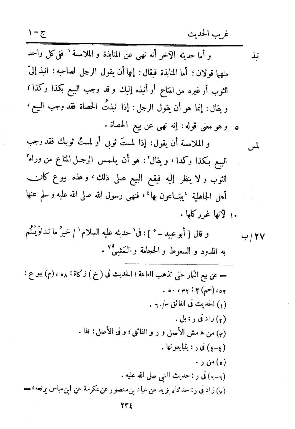 وَأما حَدِيثه الآخر أَنه نهى عَن الْمُنَابذَة وَالْمُلَامَسَة فَفِي كل وَاحِد مِنْهُمَا قَولَانِ أما الْمُنَابذَة فَيُقَال: إِنَّهَا أَن يَقُول الرجل لصَاحبه: انبذ إِلَيّ الثَّوْب أَو غَيره من الْمَتَاع أَو أنبذه إِلَيْك وَقد وَجب البيع بِكَذَا وَكَذَا وَيُقَال: إِنَّمَا هُوَ أَن يَقُول الرجل: إِذا نبذت الْحَصَاة فقد وَجب البيع وَهُوَ معنى قَوْله: إِنَّه نهى عَن بيع الْحَصَاة. وَالْمُلَامَسَة أَن يَقُول: إِذا لمست ثوبي أَو لمست ثَوْبك فقد وَجب البيع بِكَذَا وَكَذَا وَيُقَال: هُوَ أَن يلمس الرجل الْمَتَاع من وَرَاء الثَّوْب وَلَا ينظر إِلَيْهِ فَيَقَع البيع على ذَلِك وَهَذِه بُيُوع كَانَ أهل الْجَاهِلِيَّة يبتاعون بهَا فَنهى رَسُول اللَّه صلي اللَّه عَلَيْهِ وَسلم عَنْهَا لِأَنَّهَا غرر كلهَا. 27 / ب
