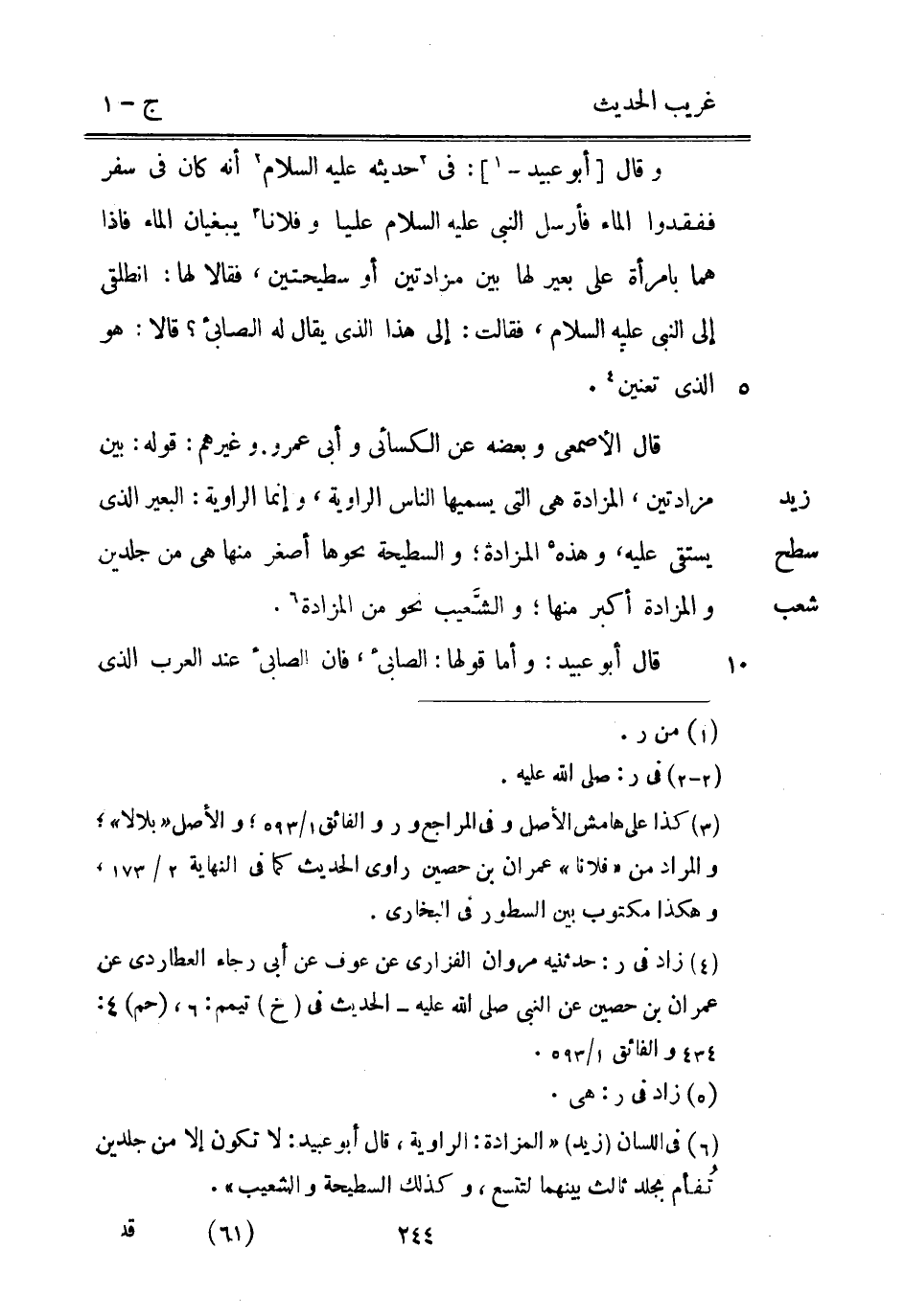 زيد سطح شعب وَقَالَ [أَبُو عُبَيْد -] : فِي حَدِيثه عَلَيْهِ السَّلَام أَنه كَانَ فِي سفر ففقدوا المَاء فَأرْسل النَّبِيّ عَلَيْهِ السَّلَام عليا وَفُلَانًا يبغيان المَاء فَإِذا هما بِامْرَأَة على بعير لَهَا بَين مزادتين أَو سطيحتين فَقَالَا لَهَا: انطلقي إِلَى النَّبِيّ عَلَيْهِ السَّلَام فَقَالَت: إِلَى هَذَا الَّذِي يُقَال لَهُ الصَّابِئ قَالَا: هُوَ الَّذِي تعنين. قَالَ الْأَصْمَعِي وَبَعضه عَن الْكسَائي وَأبي عَمْرو وَغَيرهم: قَوْله: بَين مزادتين المزادة هِيَ الَّتِي يسميها النَّاس الراوية وَإِنَّمَا الراوية: الْبَعِير الَّذِي يَسْتَقِي عَلَيْهِ وَهَذِه المزادة والسطيحة نَحْوهَا أَصْغَر مِنْهَا هِيَ من جلدين والمزادة أكبر مِنْهَا والشَّعيب نَحْو من المزادة.