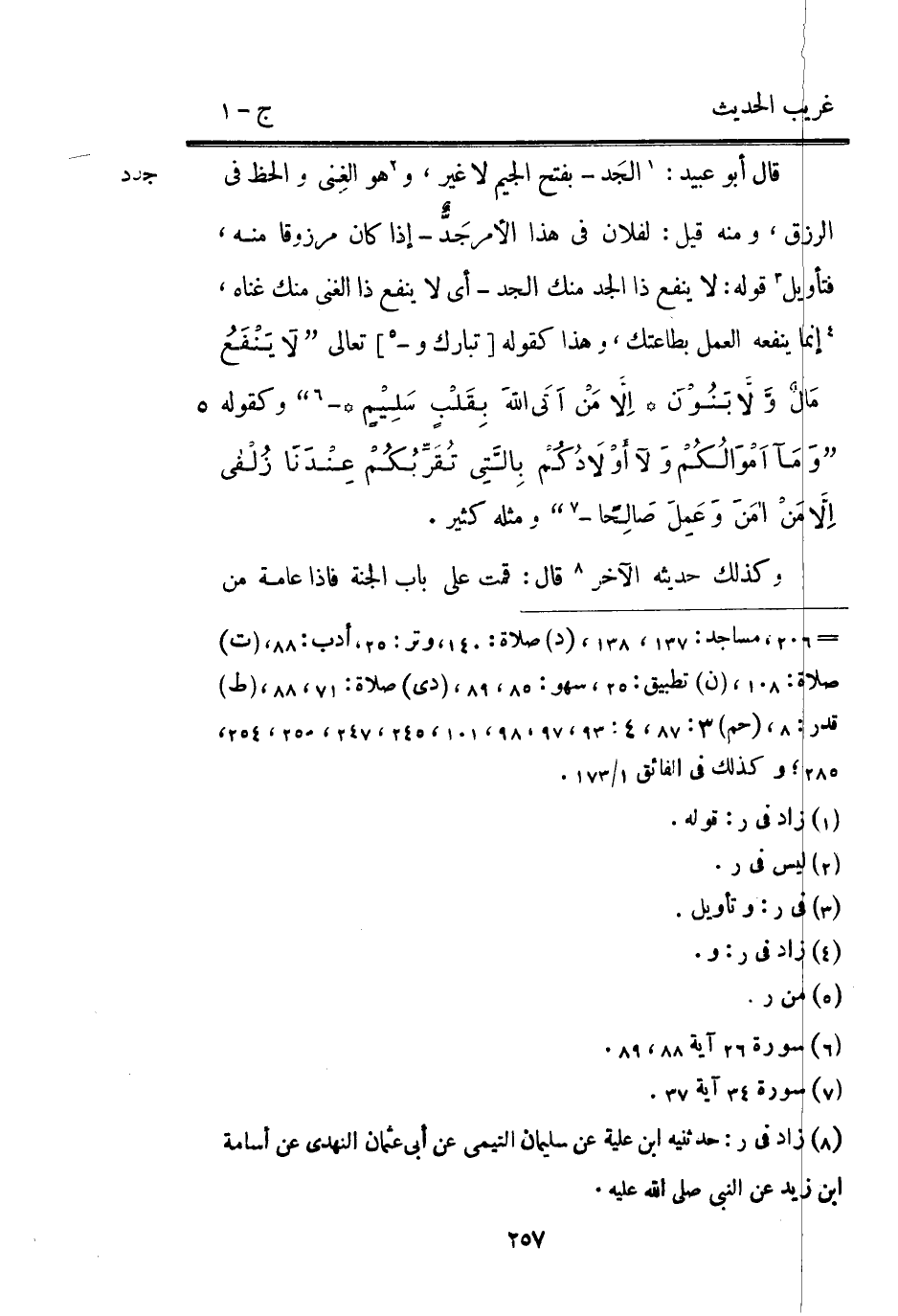 جدد إِلَّا قَالَ أَبُو عبيد: الجَد - بِفَتْح الْجِيم لَا غير وهُوَ الغِني والحظ فِي الرزق وَمِنْه قيل: لفُلَان فِي هَذَا الْأَمر جَدٌّ - إِذا كَانَ مرزوقًا مِنْهُ فَتَأْوِيل قَوْله: لَا ينفع ذَا الْجد مِنْك الْجد - أَي لَا ينفع ذَا الْغَنِيّ مِنْك غناهُ إِنَّمَا يَنْفَعهُ الْعَمَل بطاعتك وَهَذَا كَقَوْلِه [تبَارك و -] تَعَالَى {لَا يَنْفَعُ مَالٌ وَّلا بَنُوْنَ إِلا مَنْ أَتَى اللهَ بِقَلْبٍ سَلِيْمٍ} وَكَقَوْلِه {وَما أَمْوَالُكُمْ ولاَ أَوْلادُكُمْ بِالَّتي تُقَرَّبُكُمْ عِنْدَنَا زُلْفى إِلا من آمن وَعَمِلَ صَالِحاً} وَمثله كثير. وَكَذَلِكَ حَدِيثه الآخر قَالَ: قُمْت على بَاب الْجنَّة فَإِذا عَامَّة من
