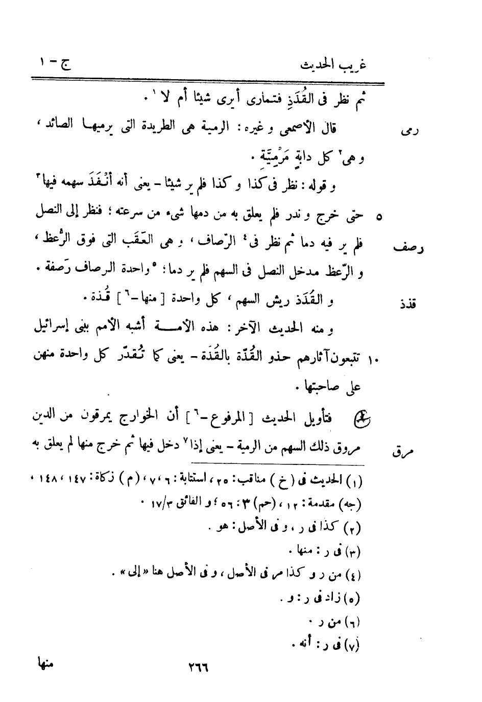 ثُمَّ نظر فِي القُذَذِ فتمارى أيرى شَيْئا أم لَا. قَالَ الْأَصْمَعِي وَغَيره: الرَّمية هِيَ الطريدة الَّتِي يرميها الصَّائِد وَهِي كل دابةٍ مَرْمِيَّةِ. وَقَوله: نظر فِي كَذَا وَكَذَا فَلم ير شَيْئا - يَعْنِي أَنه أنْفَذَ سَهْمه فِيهَا حَتَّى خرج وندر فَلم يعلق بِهِ من دَمهَا شَيْء من سرعته فَنظر إِلَى النصل فَلم ير فِيهِ دَمًا ثُمَّ نظر فِي الرصاف وَهِي العَقَب الَّتِي فَوق الرُّعظ والرعظ مدْخل النصل فِي السهْم فَلم ير دَمًا وَاحِدَة الرصاف رَصفة. والقُذَذ ريش السهْم كل وَاحِدَة [مِنْهَا -] قُذة. وَمِنْه الحَدِيث الآخر: هَذِه الْأمة أشبه الْأُمَم ببني إِسْرَائِيل تتبعون آثَارهم حَذْو القُذّة بالقُذّة - يَعْنِي كَمَا تُقدّر كل وَاحِدَة مِنْهُنَّ على صاحبتها. فَتَأْوِيل الحَدِيث [الْمَرْفُوع -] أَن الْخَوَارِج يَمْرُقُونَ من الدَّين مروق ذَلِك السهْم من الرَّمية - يَعْنِي إِذا دخل فِيهَا ثُمَّ خرج مِنْهَا لم يعلق بِهِ
