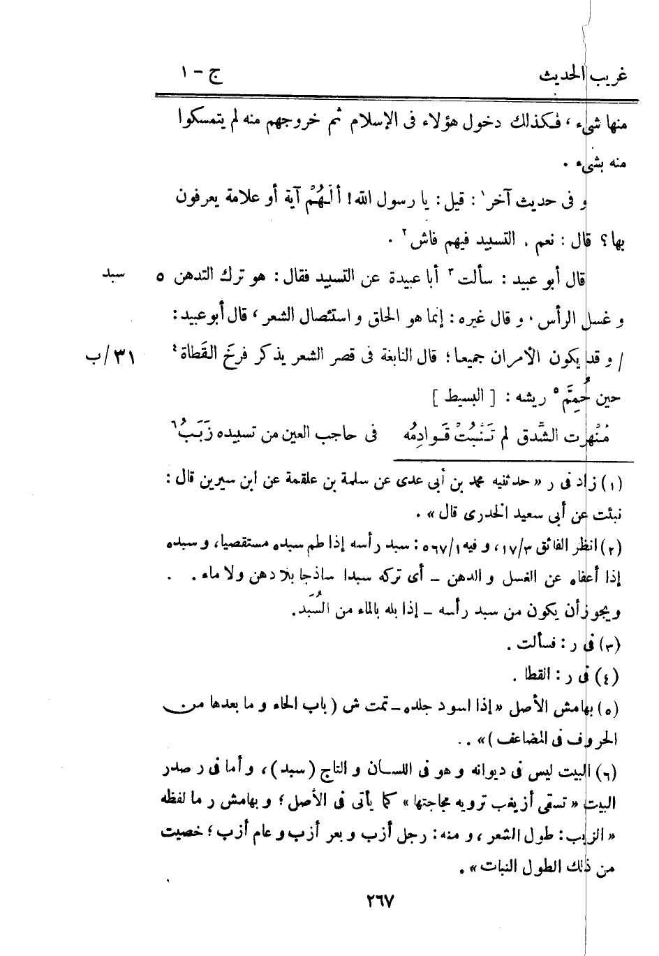 سبد قَالَ أَبُو عبيد: سَأَلت أَبَا عُبَيْدَة عَن التسبيد فَقَالَ: هُوَ ترك التدهن وَغسل الرَّأْس وَقَالَ غَيره: إِنَّمَا هُوَ الْحلق واستئصال الشّعْر قَالَ أبوعبيد: / وَقد يكون الْأَمْرَانِ جَمِيعًا قَالَ النَّابِغَة فِي قصر الشّعْر يذكر فرخ القطاة 31 / ب حِين حُمِمَّ ريشه: [الْبَسِيط]