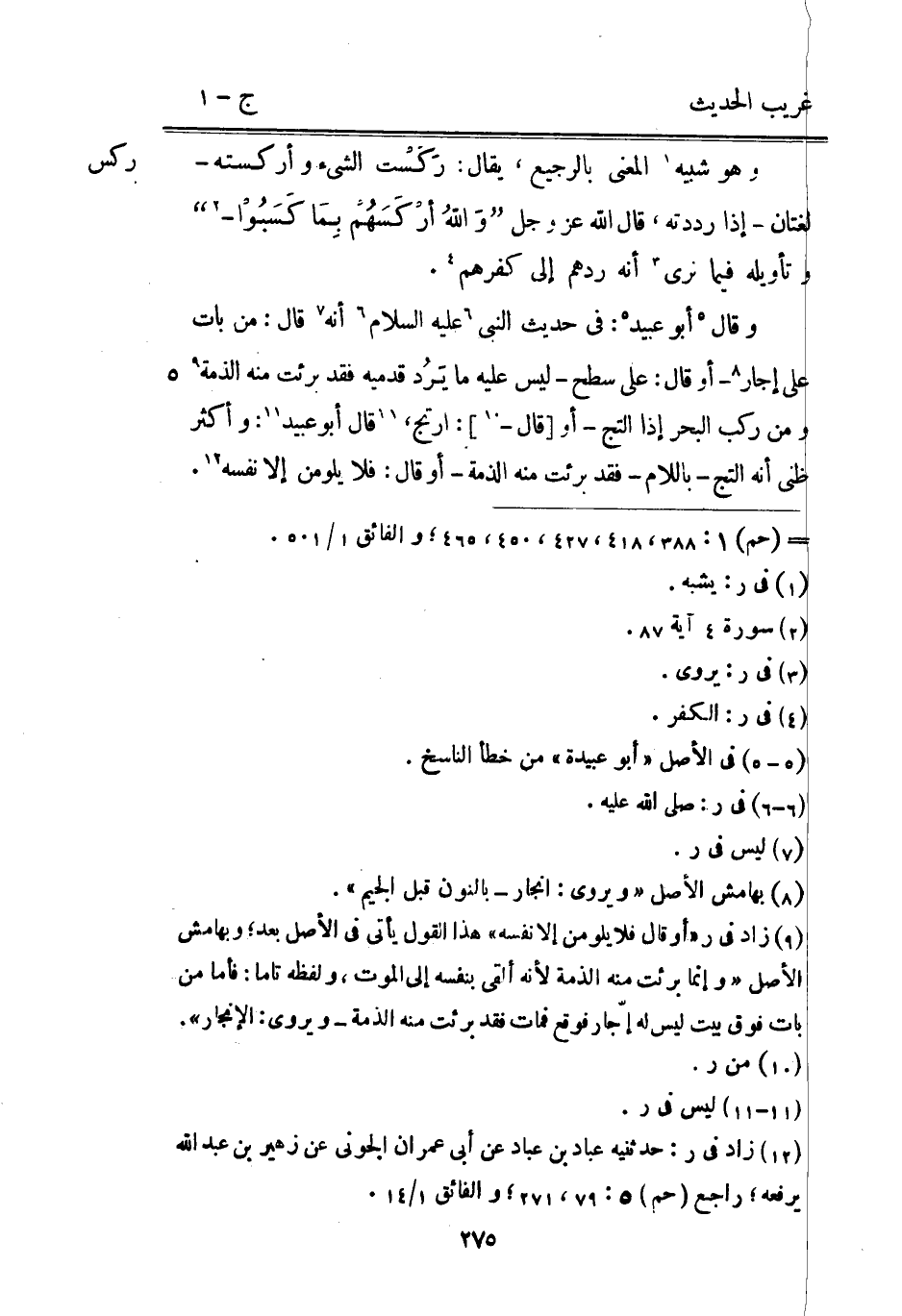 وَهُوَ شَبيه المعني بالرجيع يُقَال: ركست الشَّيْء وأركسته لُغَتَانِ إِذا رَددته قَالَ اللَّه عز وَجل {وَاللهُ أرْكَسَهُمْ بِمَا كَسَبوْا} وتأويله فِيمَا نرى أَنه ردهم إِلَى كفرهم. وقَالَ أَبُو عُبَيْدٍ: فِي حَدِيث النَّبِي عَلَيْهِ السَّلَام أَنه قَالَ: من بَات على إجار أَو قَالَ: على سطح لَيْسَ عَلَيْهِ مَا يَرُد قَدَمَيْهِ فقد بَرِئت مِنْهُ الذِّمَّة وَمن ركب الْبَحْر إِذا التج أَو [قَالَ -] : ارتج قَالَ أَبُو عُبَيْدٍ: وَأكْثر ظَنِّي أَنه التج بِاللَّامِ فقد بَرِئت مِنْهُ الذِّمَّة أَو قَالَ: فَلَا يَلُومن إِلَّا نَفسه.