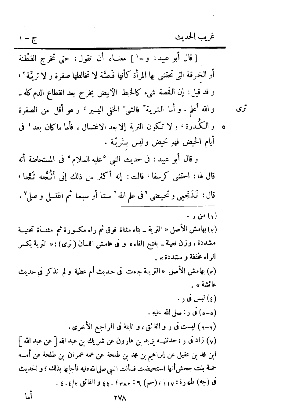 ترى قرء [قَالَ أَبُو عبيد: و -] مَعْنَاهُ أَن تَقول: حَتَّى تخرج القطْنة أَو الخِرقة الَّتِي تحتشي بهَا الْمَرْأَة كَأَنَّهَا قَصَّة لَا تخالطها صفرَة وَلَا تريَّة وَقد قيل: إِن القَصة شَيْء كالخيط الْأَبْيَض يخرج بعد انْقِطَاع الدَّم كُله _ وَالله أعلم. وَأما الترية فالشيء الْخَفي الْيَسِير وَهُوَ أقل من الصُّفْرَة والكُدرة وَلَا تكون الترية إِلَّا بعد الِاغْتِسَال فَأَما مَا كَانَ بعد فِي أَيَّام الْحيض فَهُوَ حَيض وَلَيْسَ بترية.