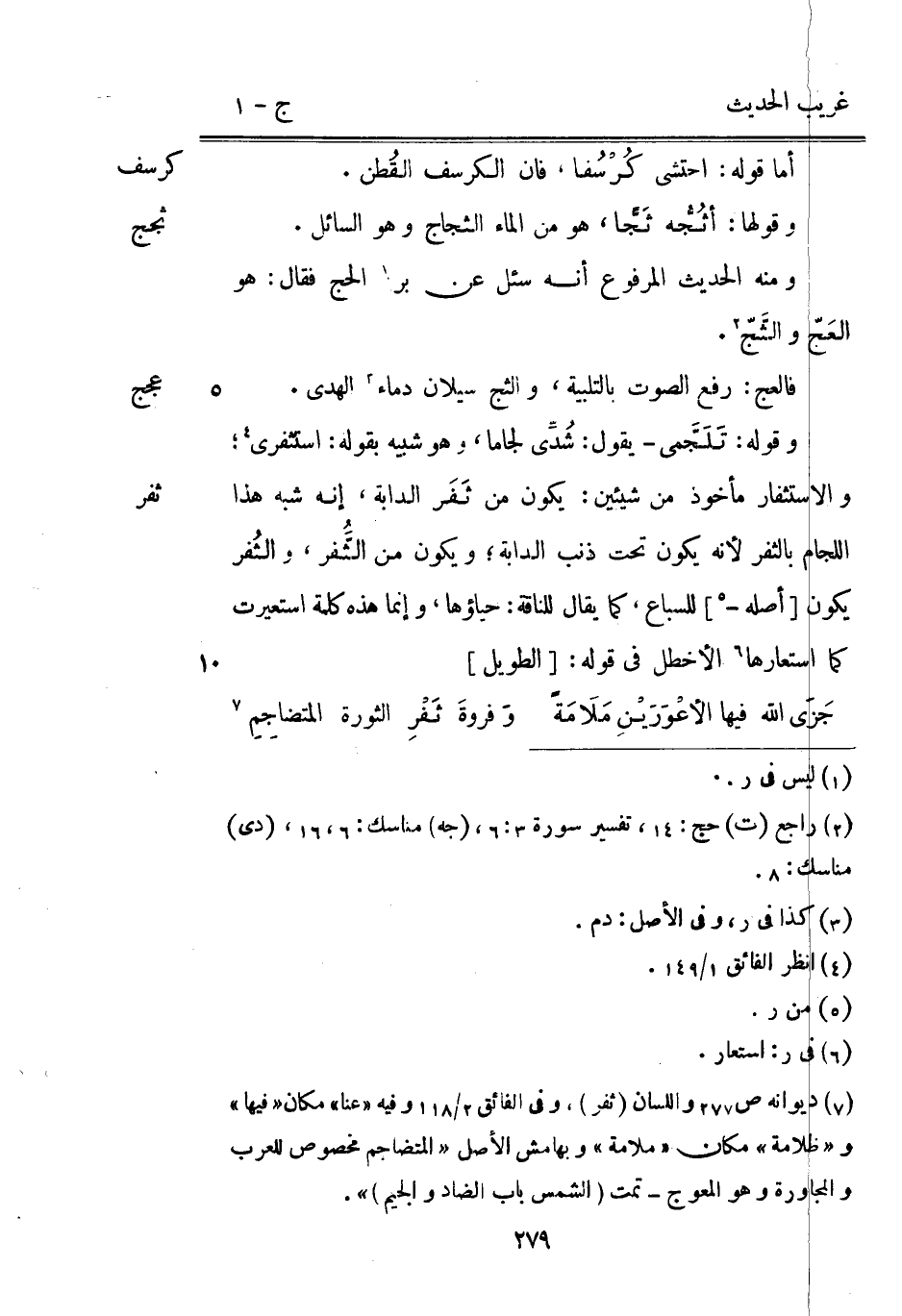 أما قَوْله: احتشي كُرْسٌفا فَإِن الكرسف القُطن. وَقَوْلها: أثُجُّه ثَجًّا هُوَ من المَاء الثجاج وَهُوَ السَّائِل. وَمِنْه الحَدِيث الْمَرْفُوع أَنه سُئِلَ عَن بر الْحَج فَقَالَ: هُوَ العَج ّوالثَّجّ. فالعج: رفع الصَّوْت بِالتَّلْبِيَةِ والثج سيلان دِمَاء الْهدى. وَقَوله: تَلَجَّمي يَقُول: شُدَّي لجاما وَهُوَ شَبيه بقوله: استثفري والاستثفار مَأْخُوذ من شَيْئَيْنِ: يكون من ثَفَر الدَّابَّة إِنَّه شبه هَذَا اللجام بالثفر لِأَنَّهُ يكون تَحت ذَنْب الدَّابَّة وَيكون من الثفر و (الثُفر) والثُفر يكون [أَصله -] للسباع كَمَا يُقَال للناقة: حياؤها وَإِنَّمَا هَذِه كلمة استعيرت كَمَا استعارها الأخطل فِي قَوْله: [الطَّوِيل]