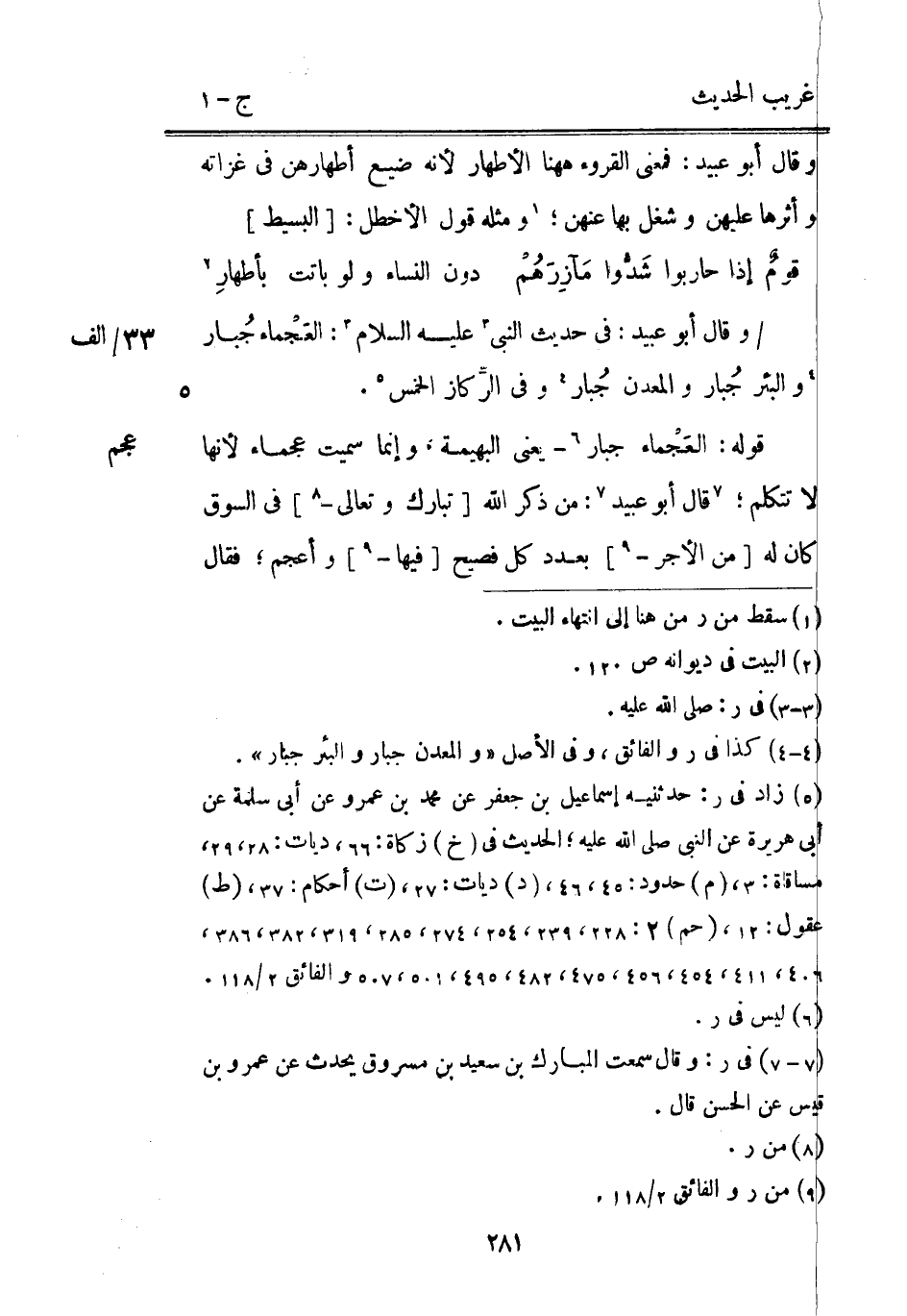 عجم وَقَالَ أَبُو عبيد: فِي حَدِيث النَّبِي عَلَيْهِ السَّلَام: العَجْماء جُبار 33 / الف والبئر جُبار والمعدن جُبار وَفِي الرَّكاز الْخمس. قَوْله: العَجْماء جَبَّار يَعْنِي الْبَهِيمَة وَإِنَّمَا سميت عجماء لِأَنَّهَا لَا تَتَكَلَّم قَالَ أَبُو عبيد: من ذكر اللَّه [تبَارك وَتَعَالَى -] فِي السُّوق كَانَ لَهُ [من الْأجر -] بِعَدَد كل فصيح [فِيهَا -] وأعجم فَقَالَ