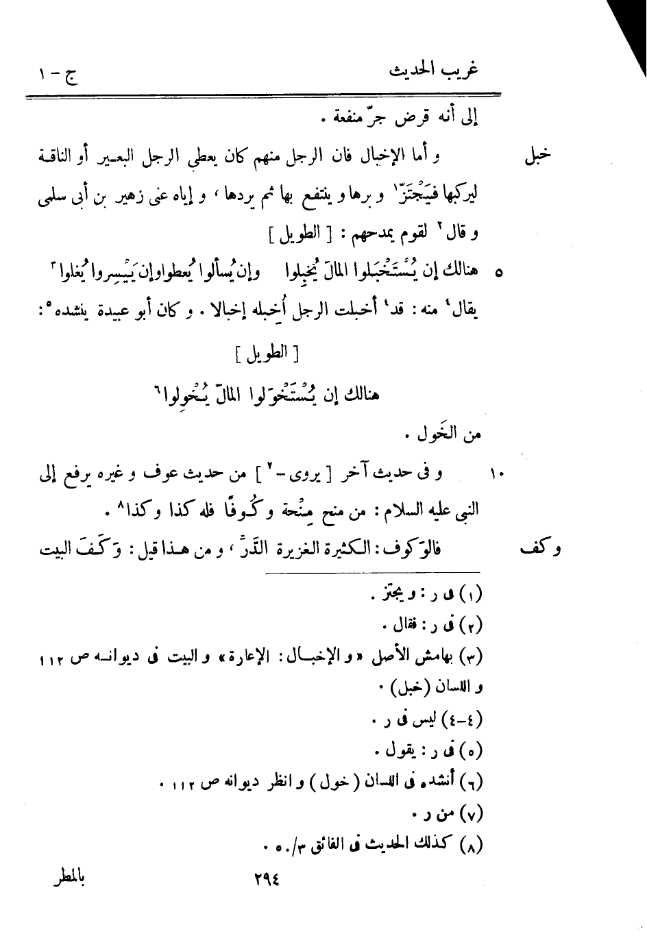 إِلَى أَنه قرض جر مَنْفَعَة. وَأما الإخبال فَإِن الرجل مِنْهُم كَانَ يُعْطي الرجل الْبَعِير أَو النَّاقة ليرْكبَهَا فيَجْتَزّ وبرها وَينْتَفع بهَا ثُمَّ يردهَا وإياه عَنى زُهَيْر بْن أَبِي سلمى وَقَالَ لقوم يمدحهم: [الطَّوِيل]