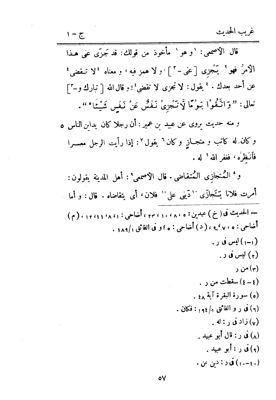 قَالَ الْأَصْمَعِي: وَهُوَ مَأْخُوذ من قَوْلك: قد جزى عَنى هَذَا الْأَمر فَهُوَ يَجْزِي [عني -] وَلَا همز فِيهِ وَمَعْنَاهُ لَا تقضي عَن أحد بعْدك. يَقُول: لَا تجزي لَا تقضي وَقَالَ اللَّه [تبَارك و -] تَعَالَى: {وَاتَقُوْا يَوْماً لَا تَجْزِيْ نَفْسٌ عَنْ نَفَسٍ شَيْئَا} . وَمِنْه حَدِيث يرْوى عَن عُبَيْد بْن عُمَيْر: أَن رجلا كَانَ يداين النَّاس وَكَانَ لَهُ كَاتب ومتجاز وَكَانَ يَقُول: إِذا رَأَيْت الرجل مُعسرا فَانْظُرْهُ فغفر اللَّه لَهُ. والمتجازي المتقاضي. قَالَ الْأَصْمَعِي: أهل الْمَدِينَة يَقُولُونَ: أمرت فلَانا يتجازى ديني على فلَان أَي يتقاضاه. قَالَ: وَأما