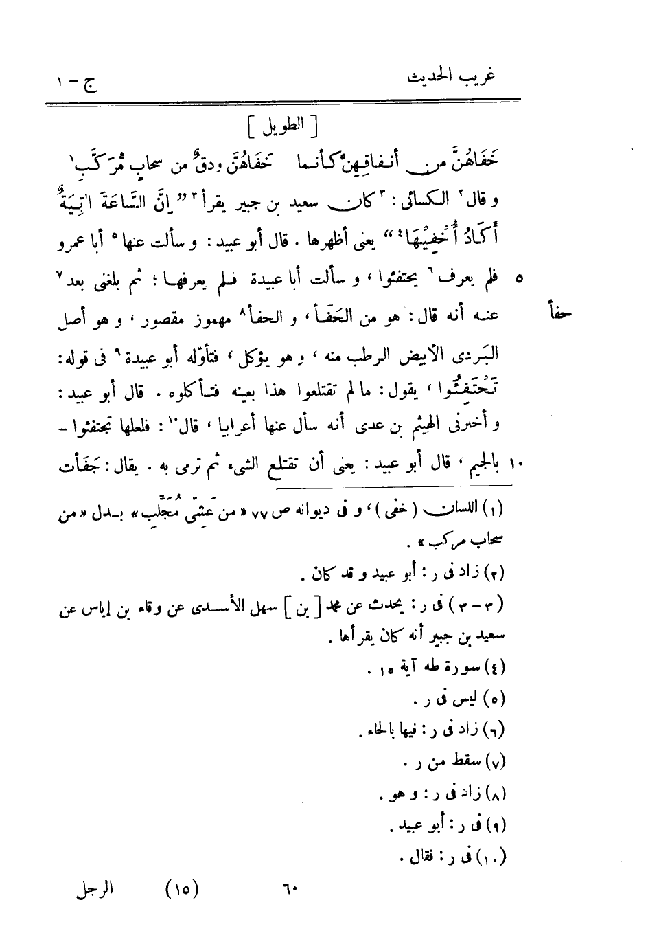 حفأ قَالَ أَبُو عُبَيْدٍ: وَسَأَلت عَنْهَا أَبَا عَمْرو فَلم يعرف يحتفئوا وَسَأَلت أَبَا عُبَيْدَة فَلم يعرفهَا ثُمَّ بَلغنِي بعد عَنْهُ أَنه قَالَ: هُوَ من الحفأ والحفأ مَهْمُوز مَقْصُور وَهُوَ أصل البردى الْأَبْيَض الرطب مِنْهُ وَهُوَ يُؤْكَل فتأوله أَبُو عُبَيْدَة فِي قَوْله: تحتفئوا يَقُول: مَا لم تقتلعوا هَذَا بِعَيْنِه فتأكلوه. قَالَ أَبُو عبيد: وَأَخْبرنِي الْهَيْثَم بْن عدي أَنه سَأَلَ عَنْهَا أَعْرَابِيًا قَالَ: فلعلها تجتفئوا - بِالْجِيم