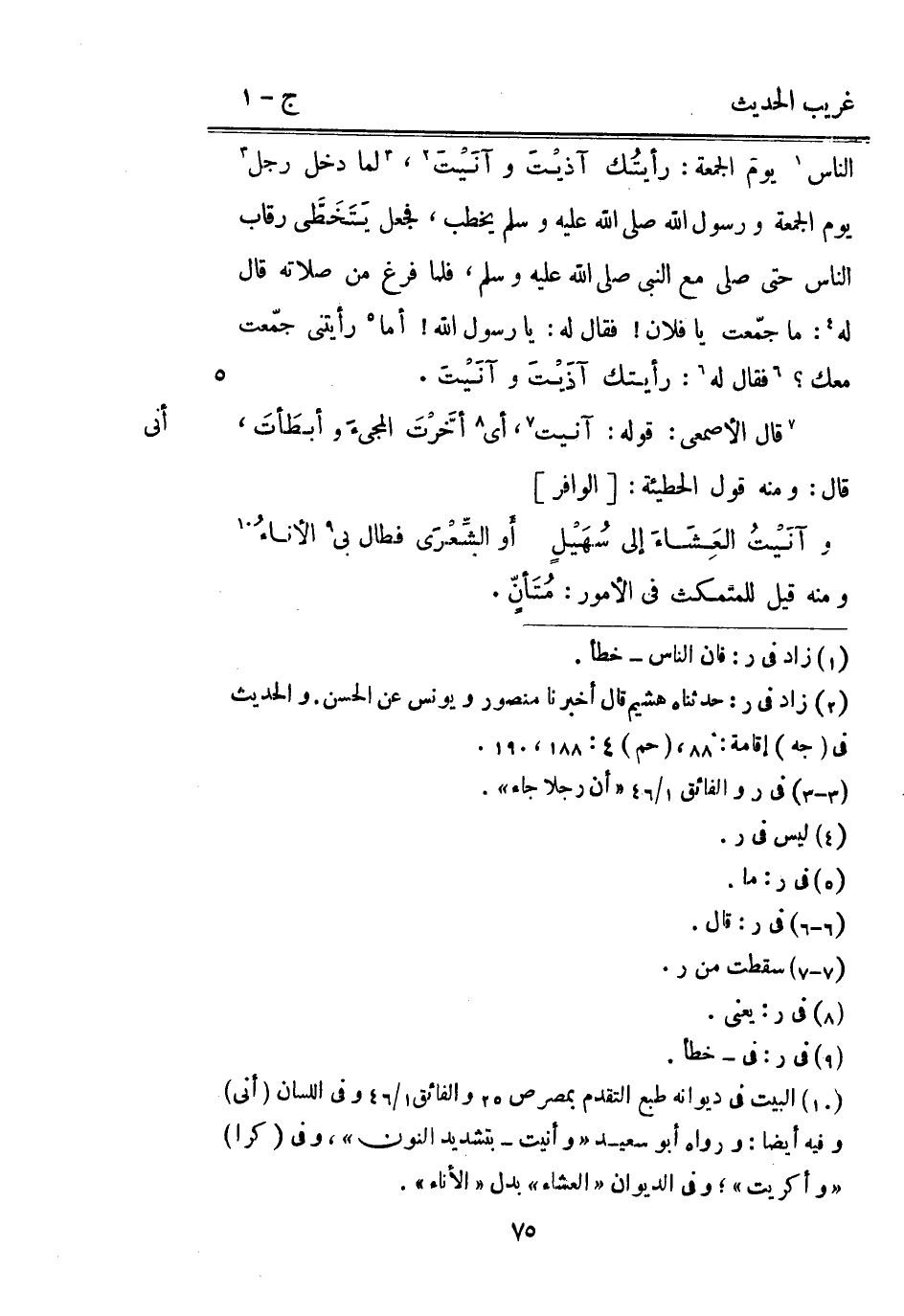 النَّاس يَوْم الْجُمُعَة: رأيتُك آذيْتَ وآنَيْتَ لما دخل رَجُل يَوْم الْجُمُعَة وَرَسُول اللَّه صلي اللَّه عَلَيْهِ وَسلم يخْطب فَجعل يتخطى رِقَاب النَّاس حَتَّى صلى مَعَ النَّبِيّ صلي الله عَلَيْهِ وَسلم فَلَمَّا فرغ من صلَاته قَالَ لَهُ: مَا جمعت يَا فلَان فَقَالَ لَهُ: يَا رَسُول اللَّه أما رَأَيْتنِي جمعت مَعَك: رَأَيْتُك آذَيْتَ وآنَيْتَ. قَالَ الْأَصْمَعِي: قَوْله: آنيت أَي أخرت الْمَجِيء وأبطأت قَالَ: وَمِنْه قَول الحطيئة: [الوافر]