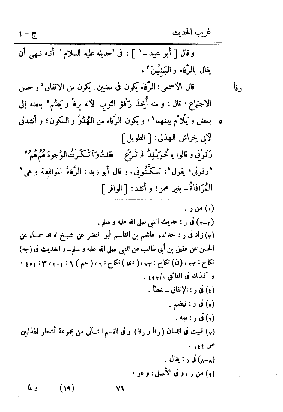رفأ وَقَالَ [أَبُو عُبَيْد -] : فِي حَدِيثه عَلَيْهِ السَّلَام أَنه نهى أَن يُقَال بالرفاء والبنين. قَالَ الْأَصْمَعِي: الرفاء يكون فِي مَعْنيين يكون من الِاتِّفَاق وَحسن الِاجْتِمَاع قَالَ: وَمِنْه أَخذ رفؤ الثَّوْب لِأَنَّهُ يرفأ وَيضم بعضه إِلَى بعض ويلأم بَينهمَا وَيكون الرفاء من الهدو والسكون وأنشدني لأبي خرَاش الْهُذلِيّ: [الطَّوِيل]